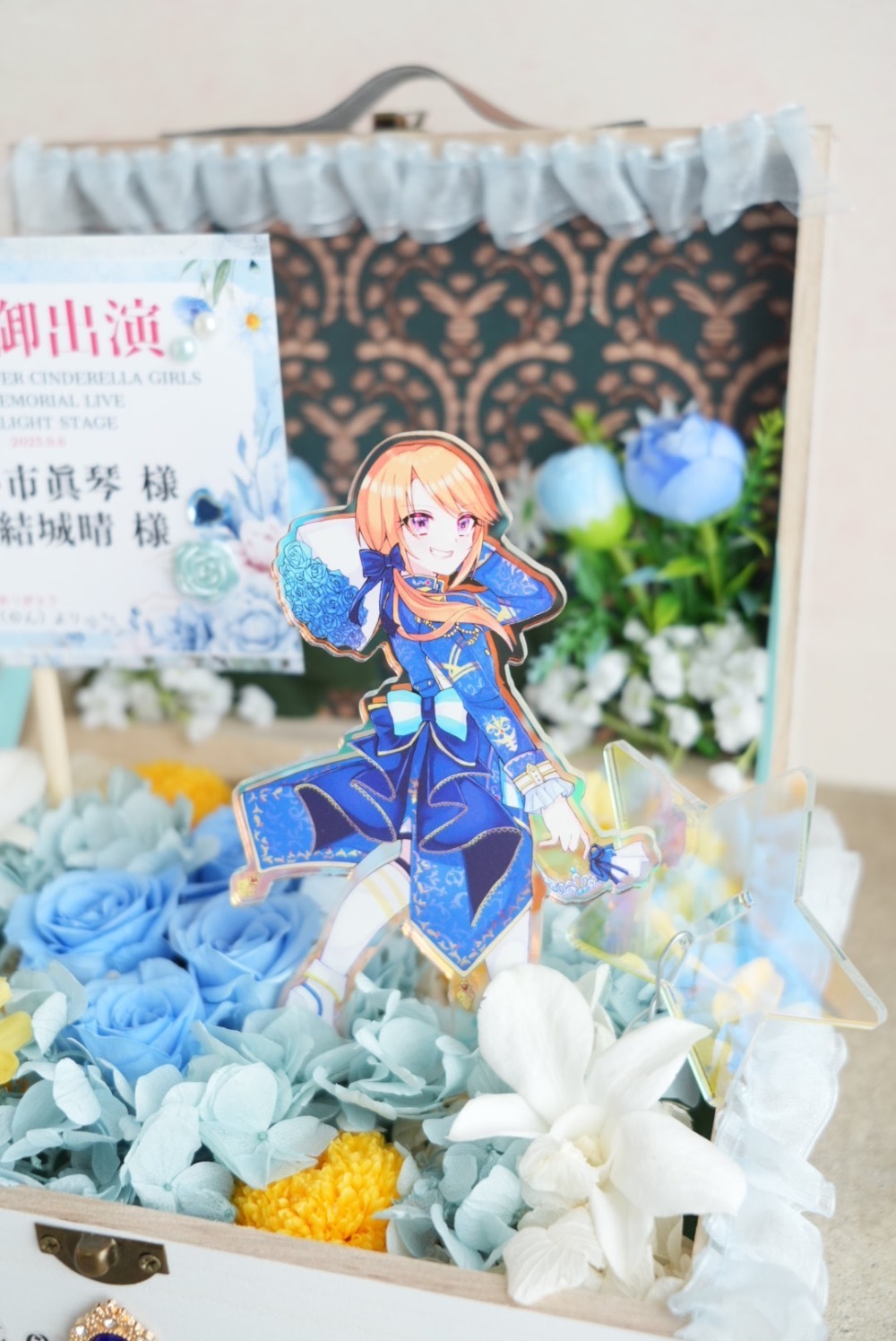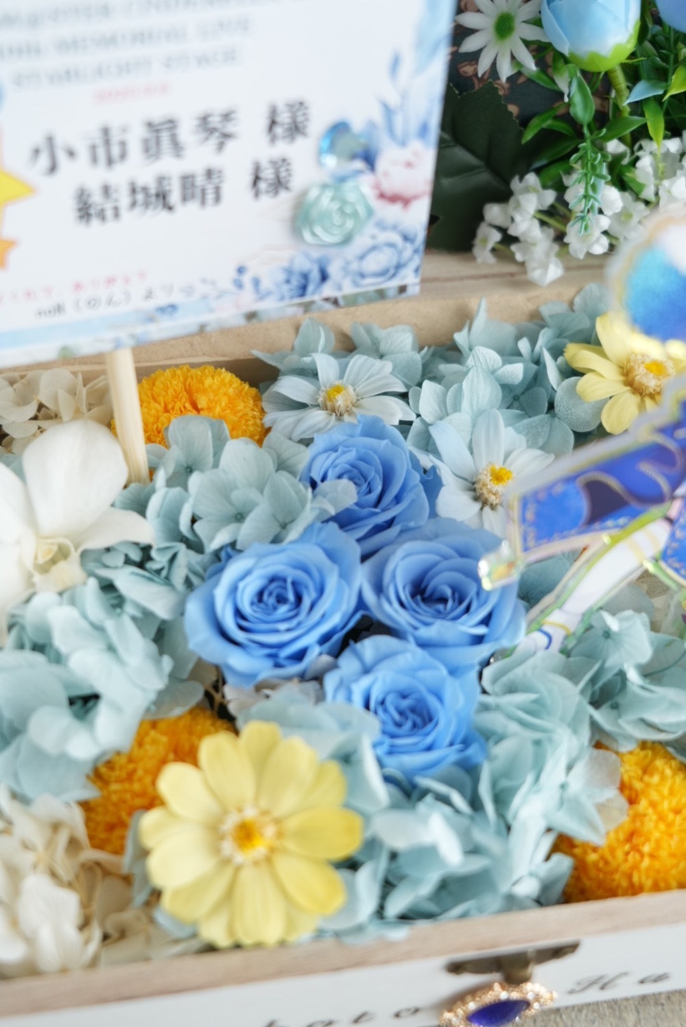 カードイラストにてキャラクター(担当アイドル)が持っている花束をイメージしたお花と、モチーフである青薔薇を4輪、プリザーブドフラワーにしてトランクにぎゅっと詰め込んでもらうようお願いしました。