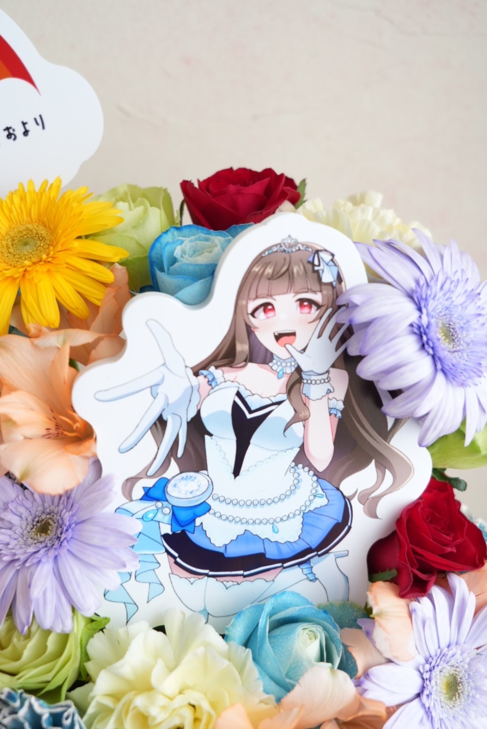 今回のイメージは神谷奈緒ちゃんのソロ楽曲である「2nd SIDE」でした。2番の歌詞にある「虹色橋を掛けるから」というフレーズに合わせてライブではプロデューサー(ファン)がペンライトを好きな色に変え虹色を表現するというものがあります。それを踏まえお花のカラーはカラフルなたくさんの色を使ったものでと依頼しました。