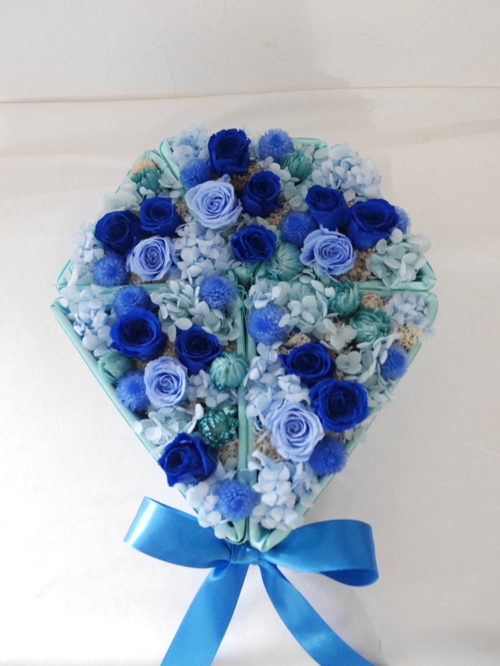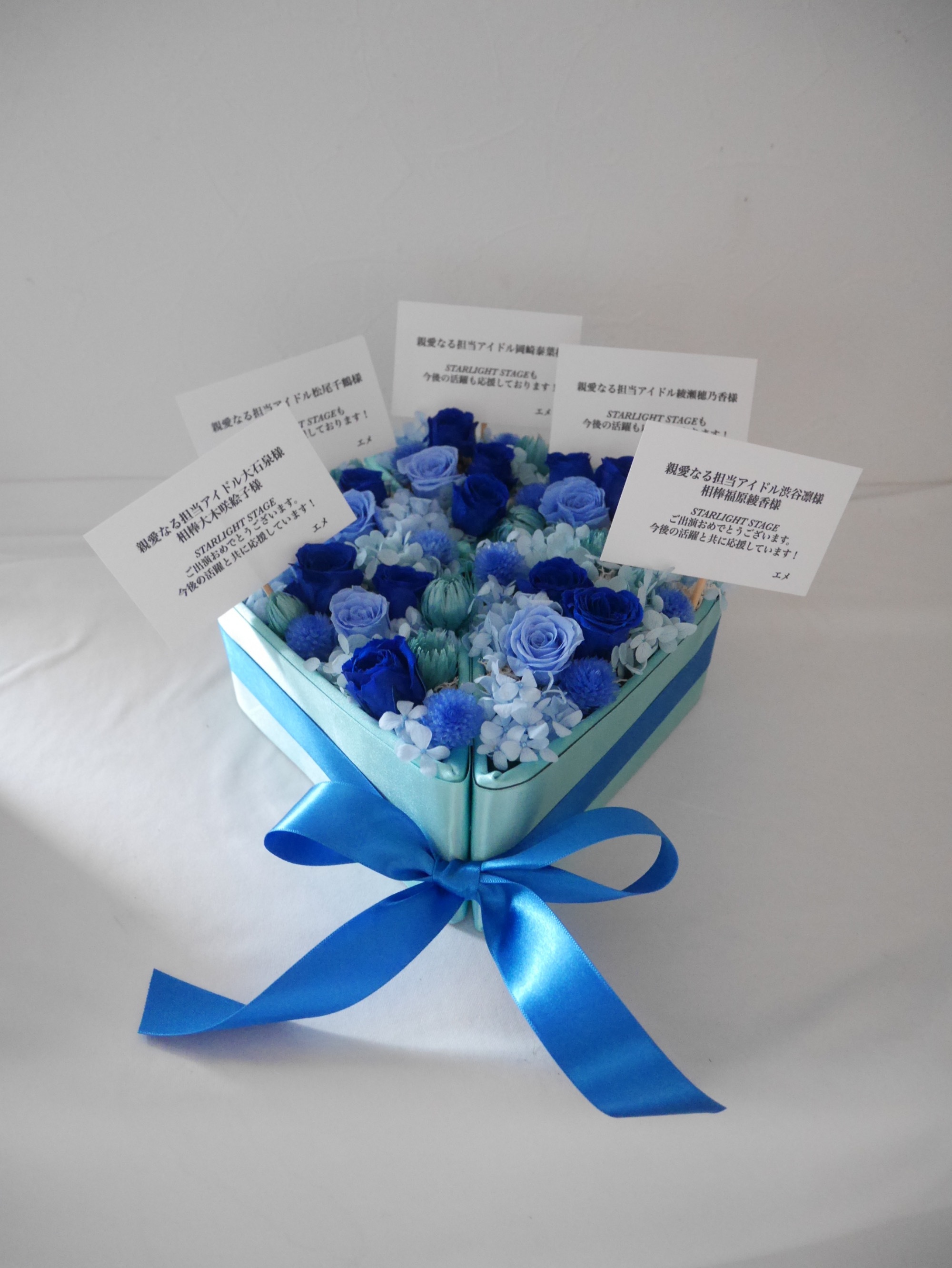 今回お贈りするアイドル全体のテーマカラーである蒼い花で全体を統一したうえで、5人の花を合わせるとテーマロゴであるダイヤモンドの形になるように箱の形を調整いただきました。今後も末永くアイドル活動ができるようという思いも込めてブリザーブドフラワーを選択し、長持ちするような楽屋花にしています。
