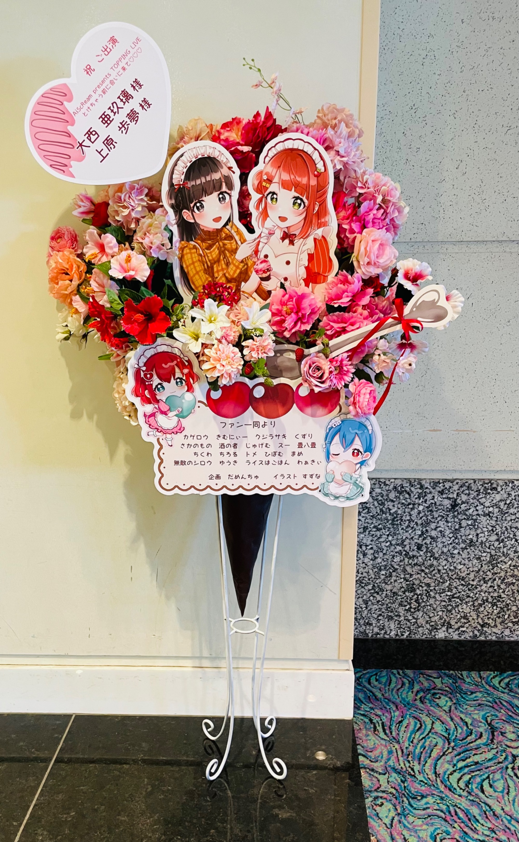 上原歩夢ちゃんと大西亜玖璃さんはストロベリーフレイバーのアイスクリームの担当なので、フラスタ全体がアイスクリームに見えるように、お花やパネルの小物をアレンジしてみました。