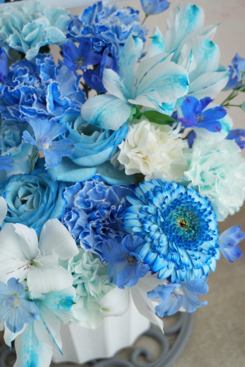 アレンジ花をお贈りした演者さんが3名ともイメージカラーが青系の色であることから、青系の色でまとめていただきました。あまり凝った装飾はせずにシンプルさ重視で依頼させていただきましたが、想像以上に素敵に仕上げていただき発注者としても大満足でした。