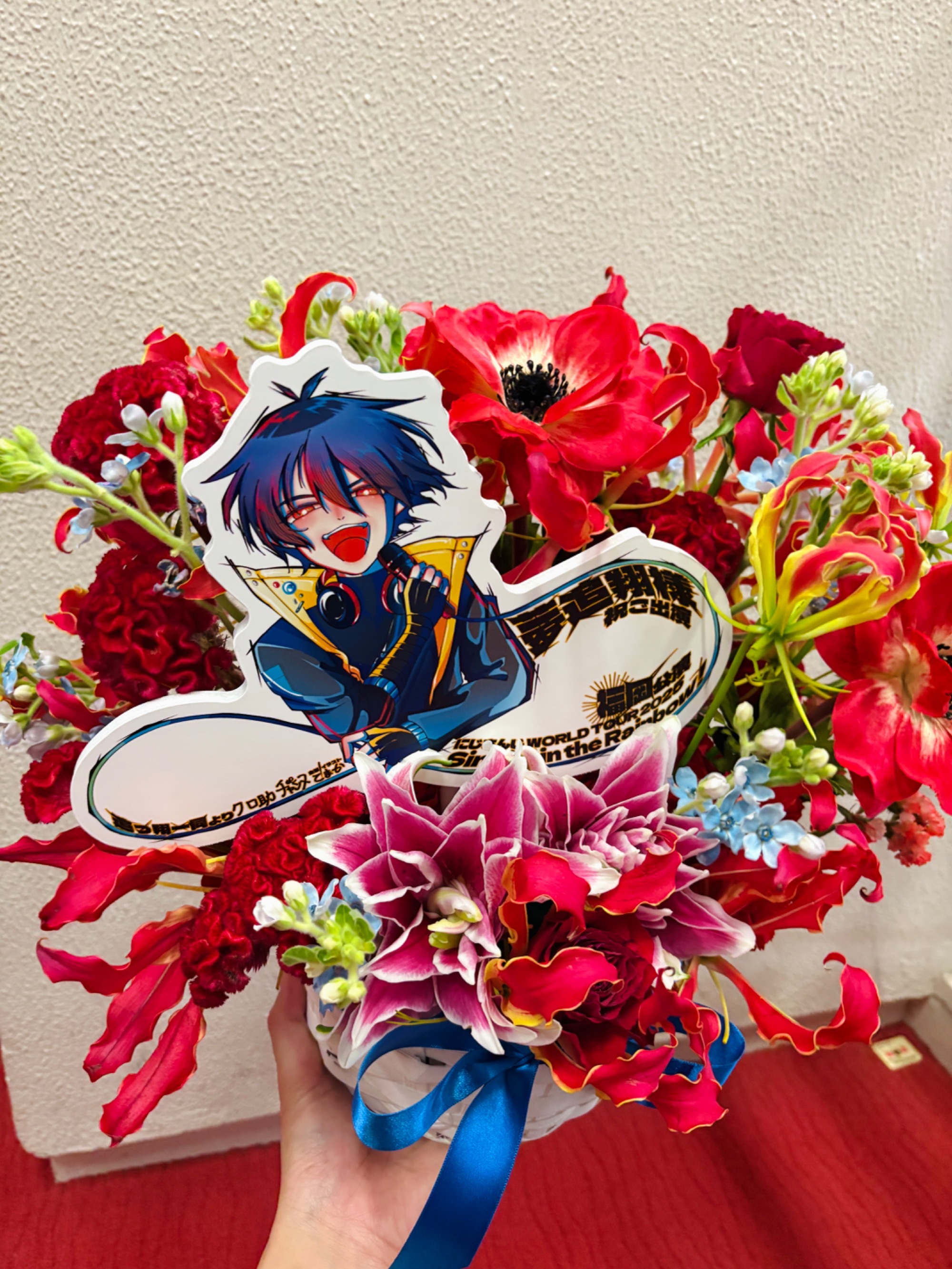 最終的に様々な種類のお花を使って頂き、どれも赤色ですがそれぞれ雰囲気の異なる赤でどのお花も主人公のような素敵な楽屋花に仕上げていただきました。水色のお花も想像していた物にかなり近くて嬉しかったです。イラストパネルもメインであるお花の存在を損ねないちょうどいい位置に配置してくださいました。