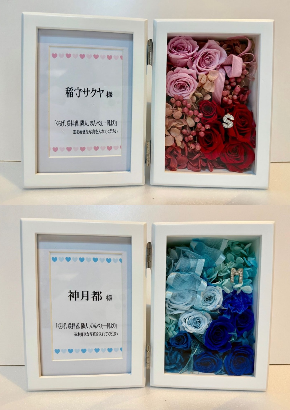 それを形に出来るのがフォトフレームでした。色はそれぞれのイメージカラーを使っていただきました。ワンポイントのチャームはデザイナー様からのご提案で、こちらとしてもとっても素敵なご提案だったのでそのまま採用させていただきました。