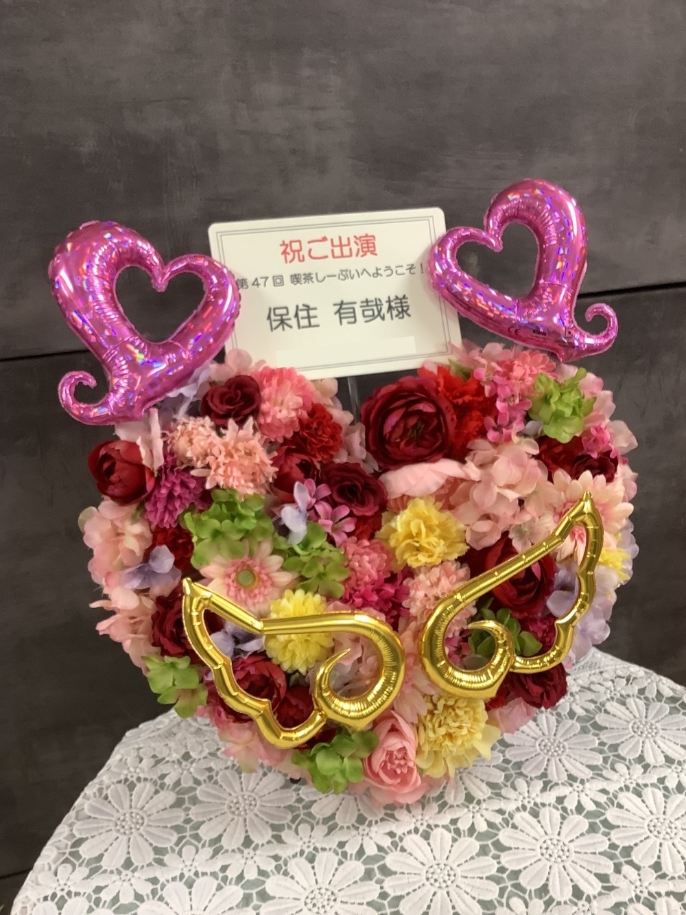 #15,000円 #公演・出演祝い #フラワーデザイナーかわむら #ピンク #造花 #楽屋花 #推し花 #ライクスホール #保住有哉 #声優 #喫茶しーぷい #バルーン #ハート型 #可愛い