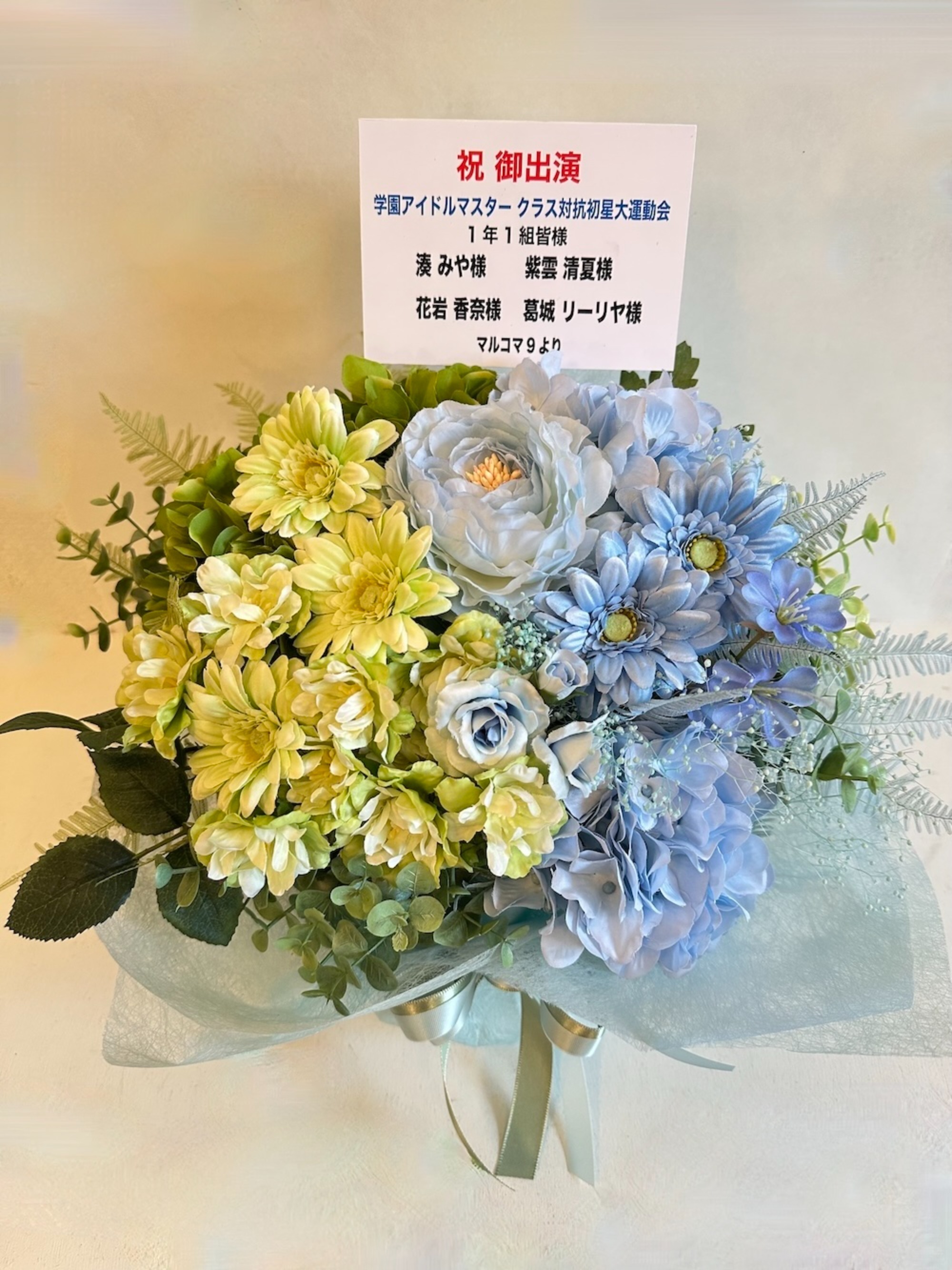 #15,000円 #公演・出演祝い #フラワーデザイナーEMI #グリーン #造花 #楽屋花 #推し花 #国立代々木競技場 #湊みや #花岩香奈 #声優 #アイマスシリーズ #学園アイドルマスター #ツートンカラー #可愛い