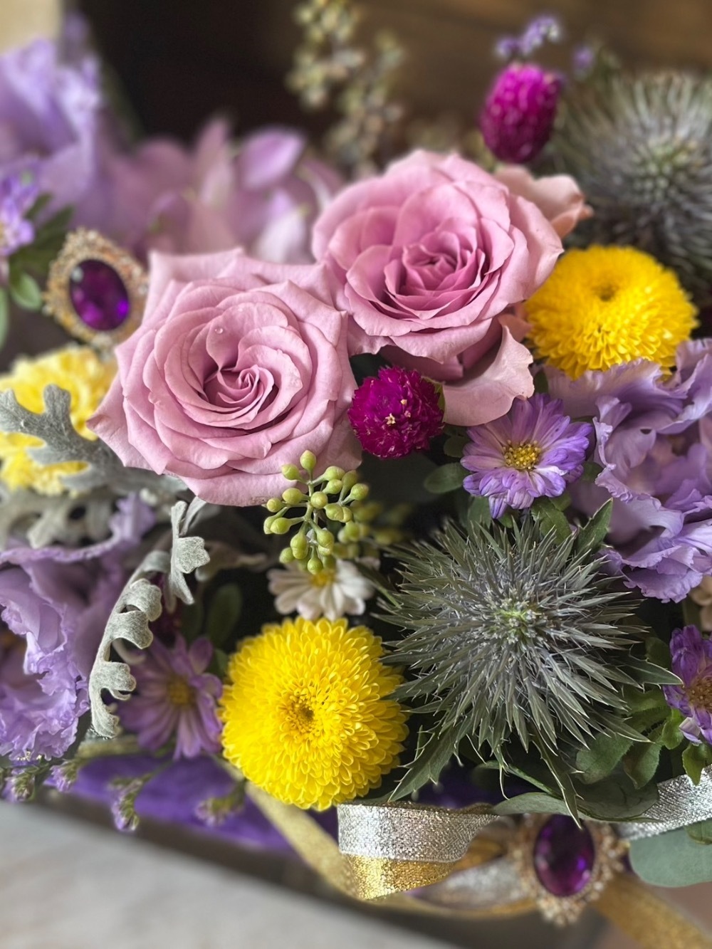 紫のバラは「気品」、エリンジウムは「光を求める」、紫のマムは「夢が叶う」、紫のトルコキキョウは「希望」、ダスティミラーは「あなたを支えます」です。