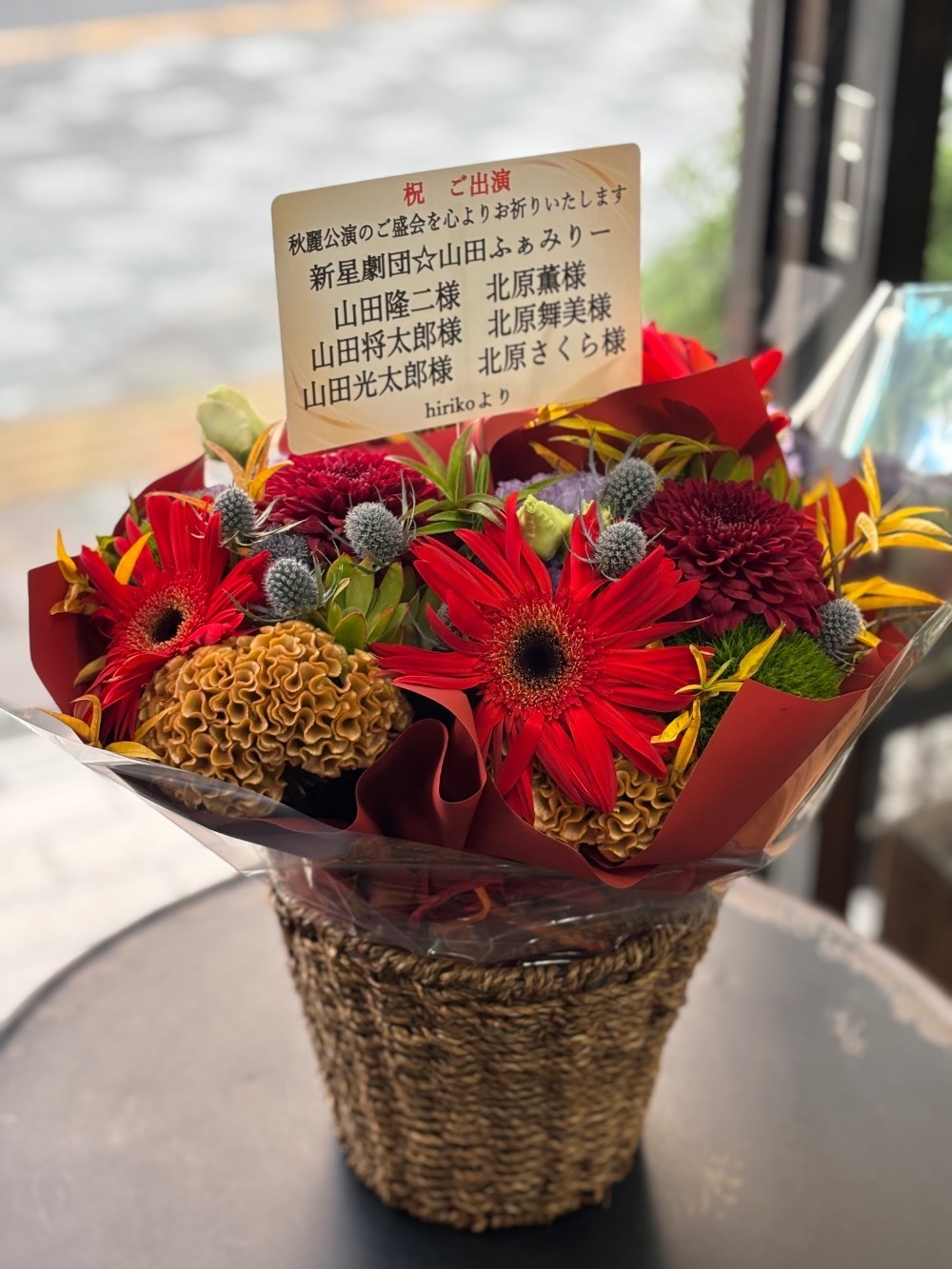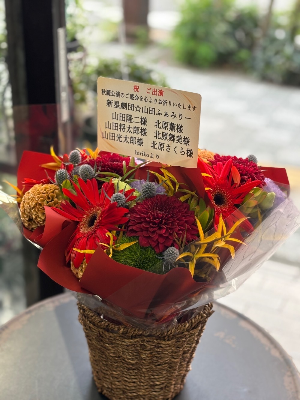 前日にいただいた完成品の写真を見て、そんな思いを如実に表現されたお品に、まずは私が感動してしまいました。秋らしい印象の中に華やかさがある上に、劇団のみなさんのパフォーマンスから感じられる力強さも添えられたアレンジメントで、公演のお祝いとしてまさに似つかわしいお品だと思いました。