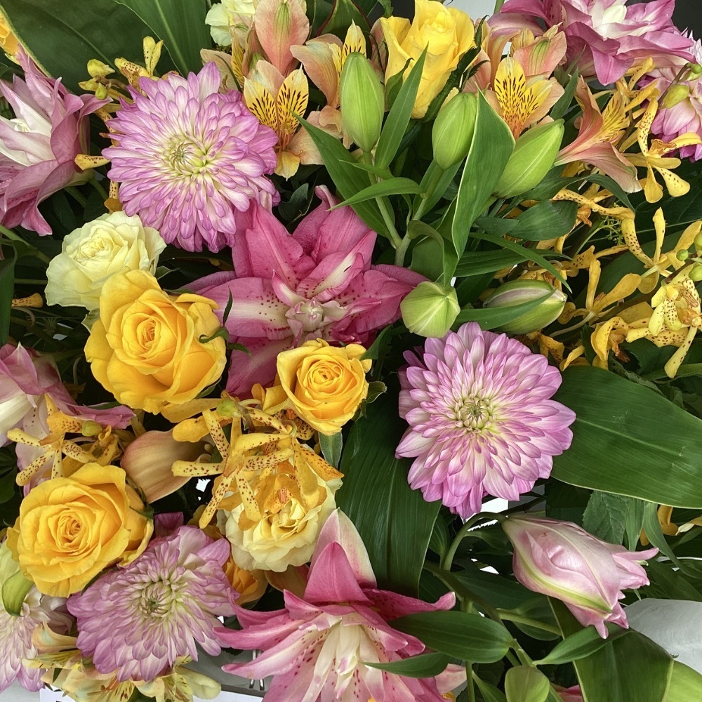 黄色・ピンクの花がきれいに混ざるように注文させていただきました。