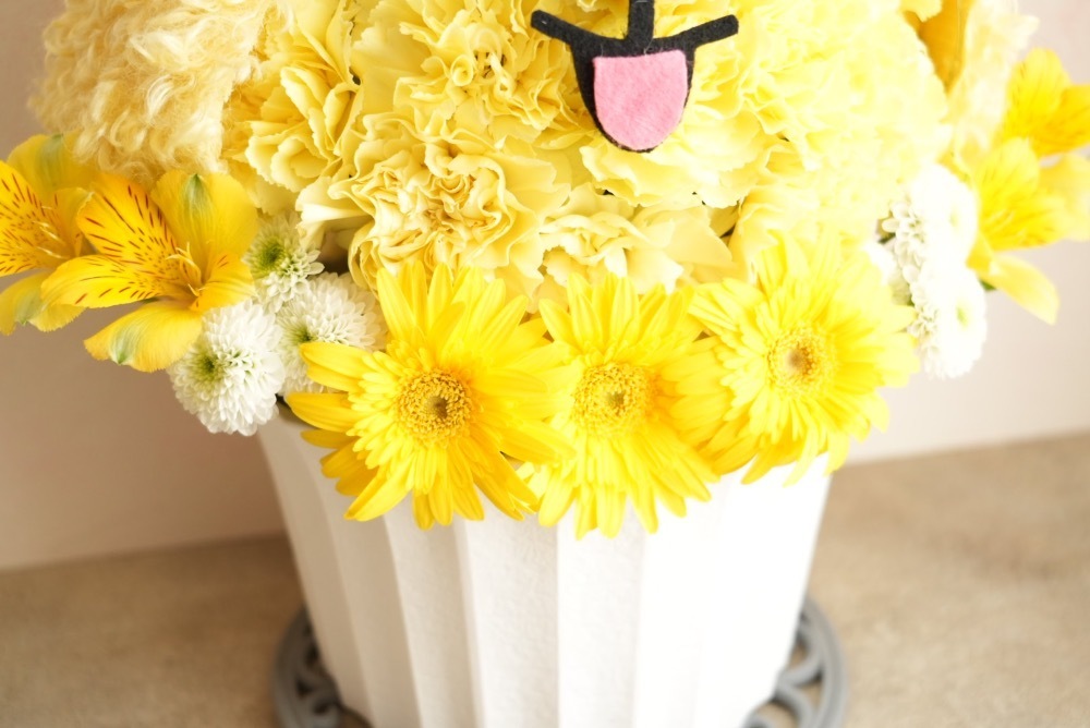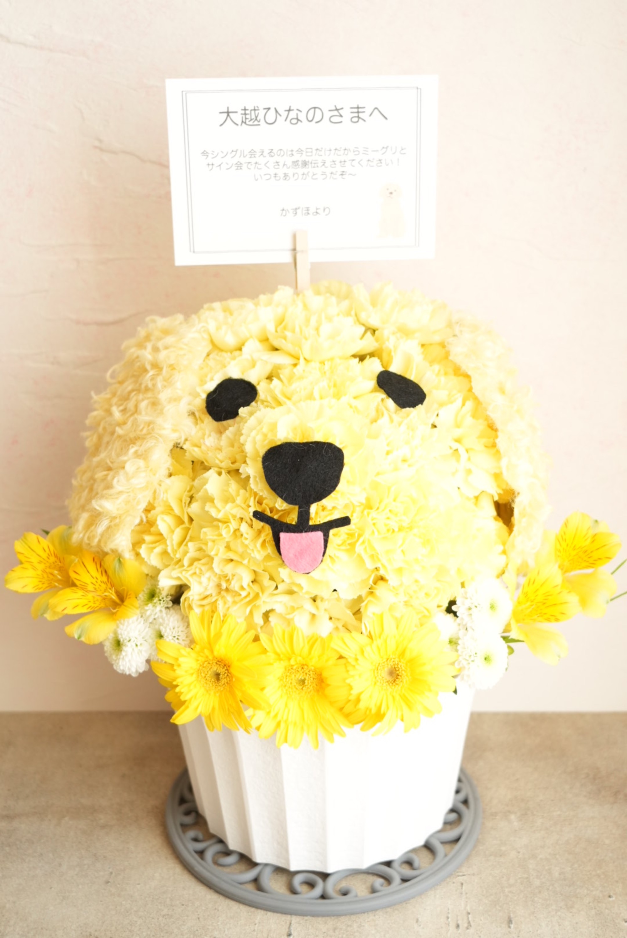 大越ひなのさんのサイリウムカラーが黄色と白色で、黄色はぜひ入れたいと思ったのと、彼女も私もゴールデンレトリバーが好きということでこのようなお花をお願いしました。