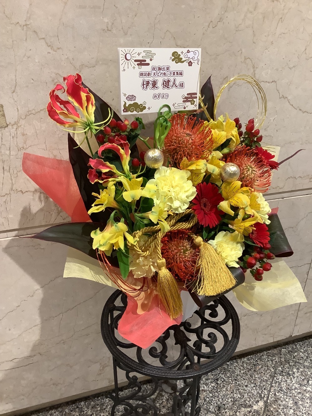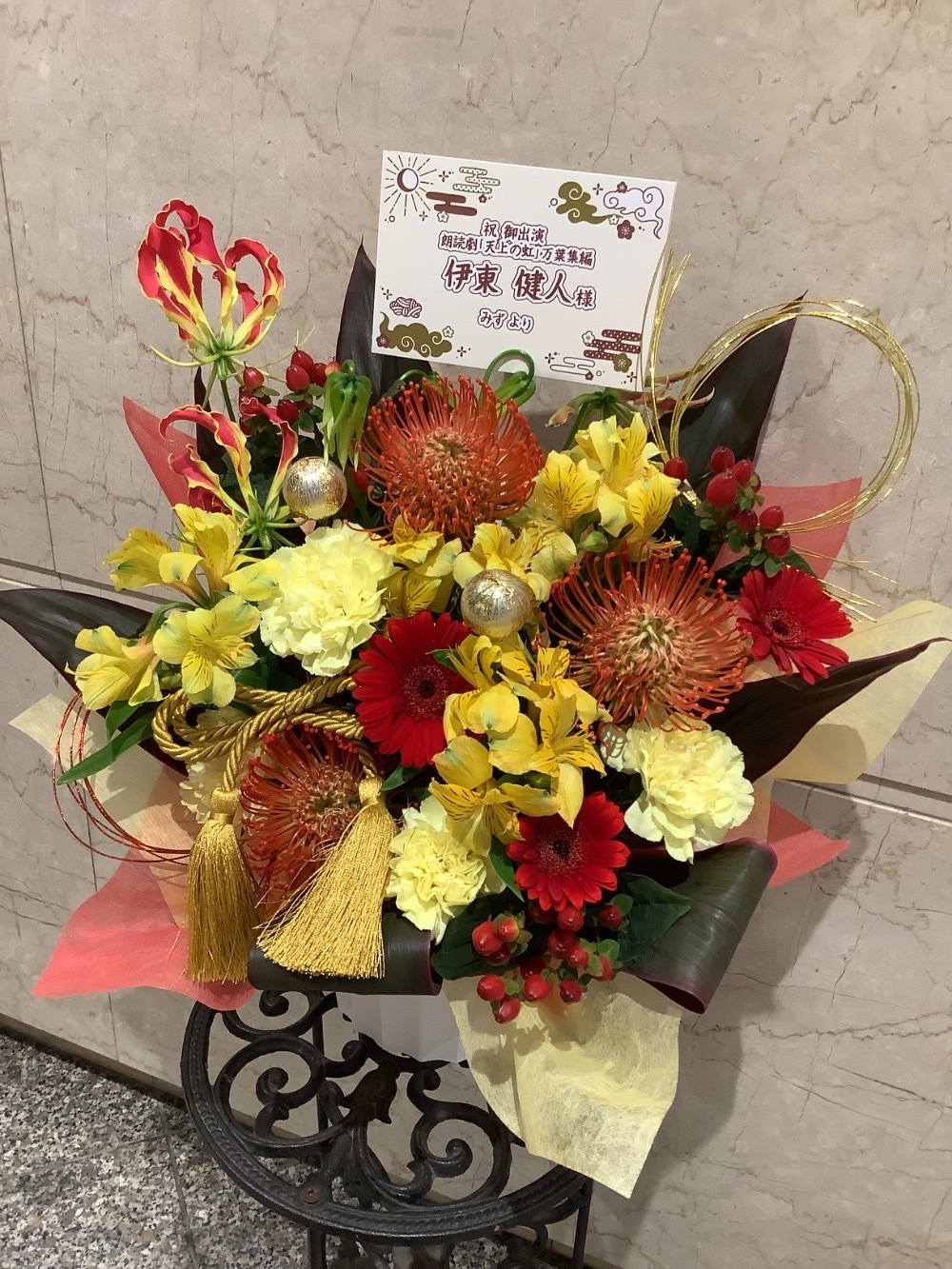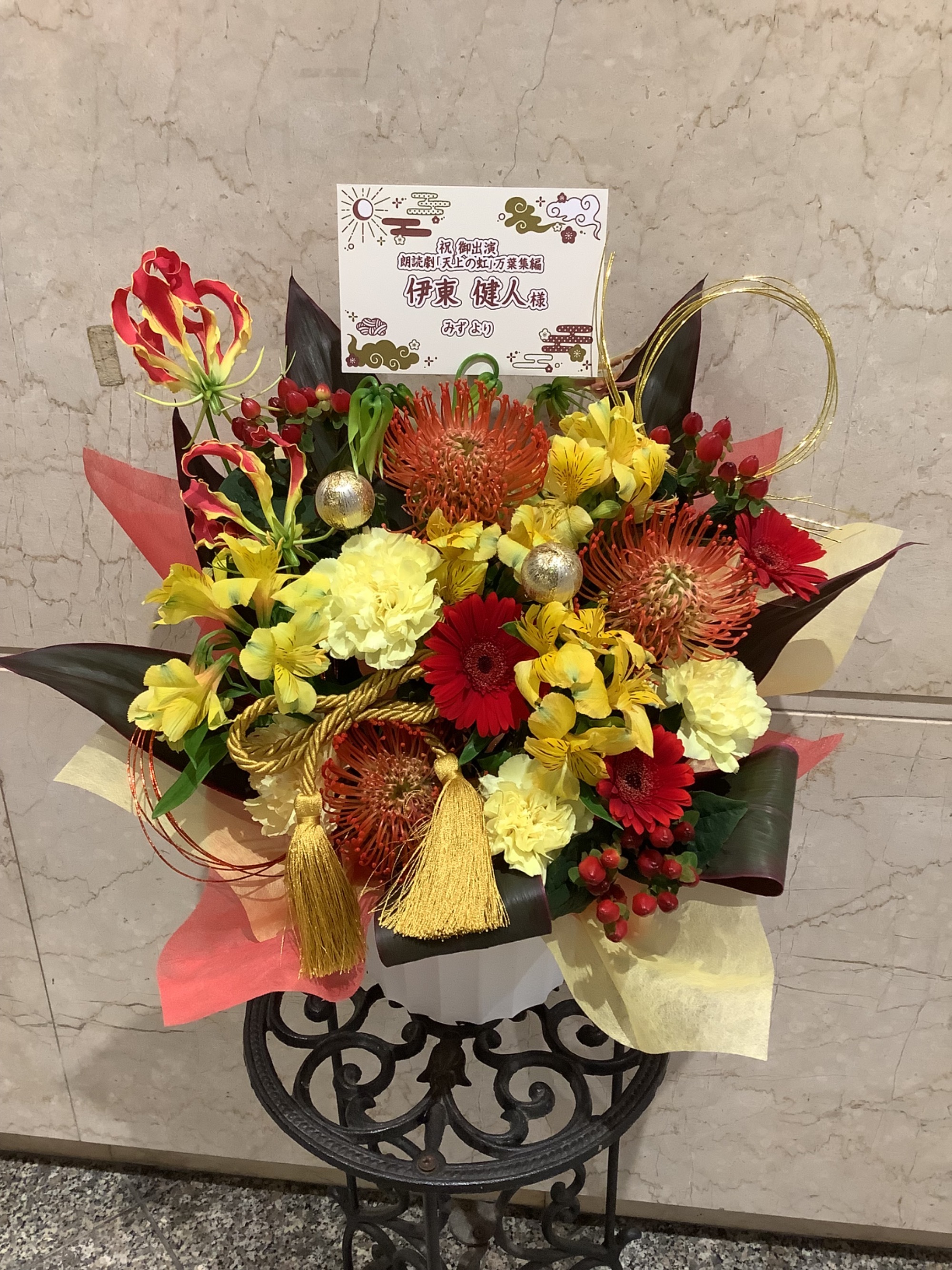 #10,000円 #公演・出演祝い #フラワーデザイナーかわむら #赤 #楽屋花 #推し花 #あうるすぽっと #伊東健人 #声優朗読劇 #和風 #オリジナル立て札 #黄