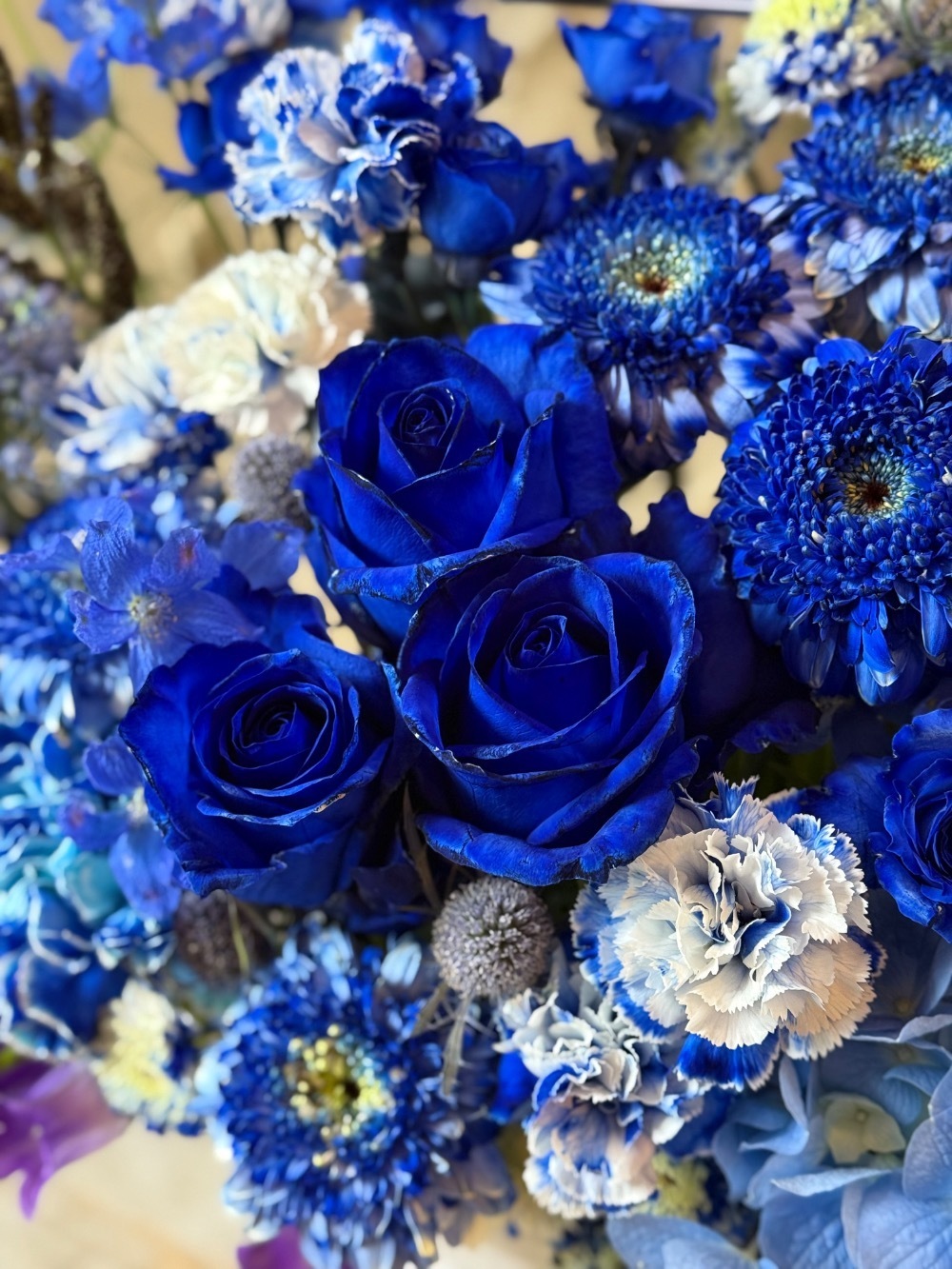 青の濃淡をベースにお作り致しました。 メインとなるのはバラ、八重咲きガーベラ、エリンジューム、マム、カーネーション、デルフィニウム、あじさい、などです。 全体にシックな色合いでまとめております。