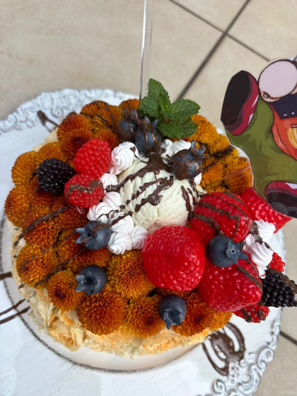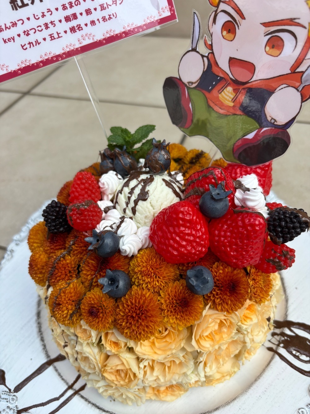 フラワーケーキのイメージでパンケーキのお花を出せたらと思い