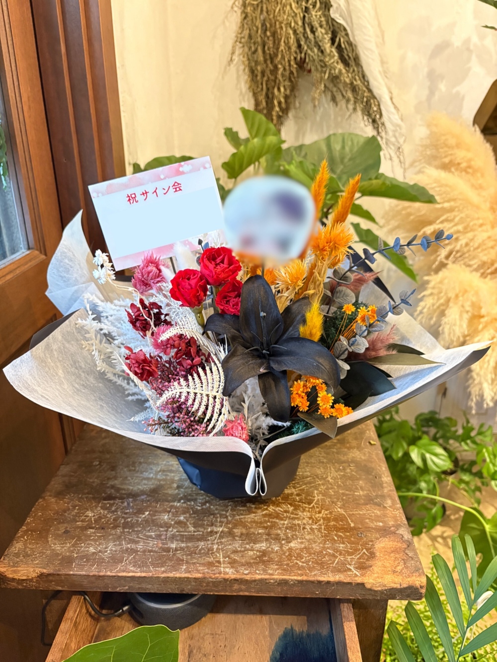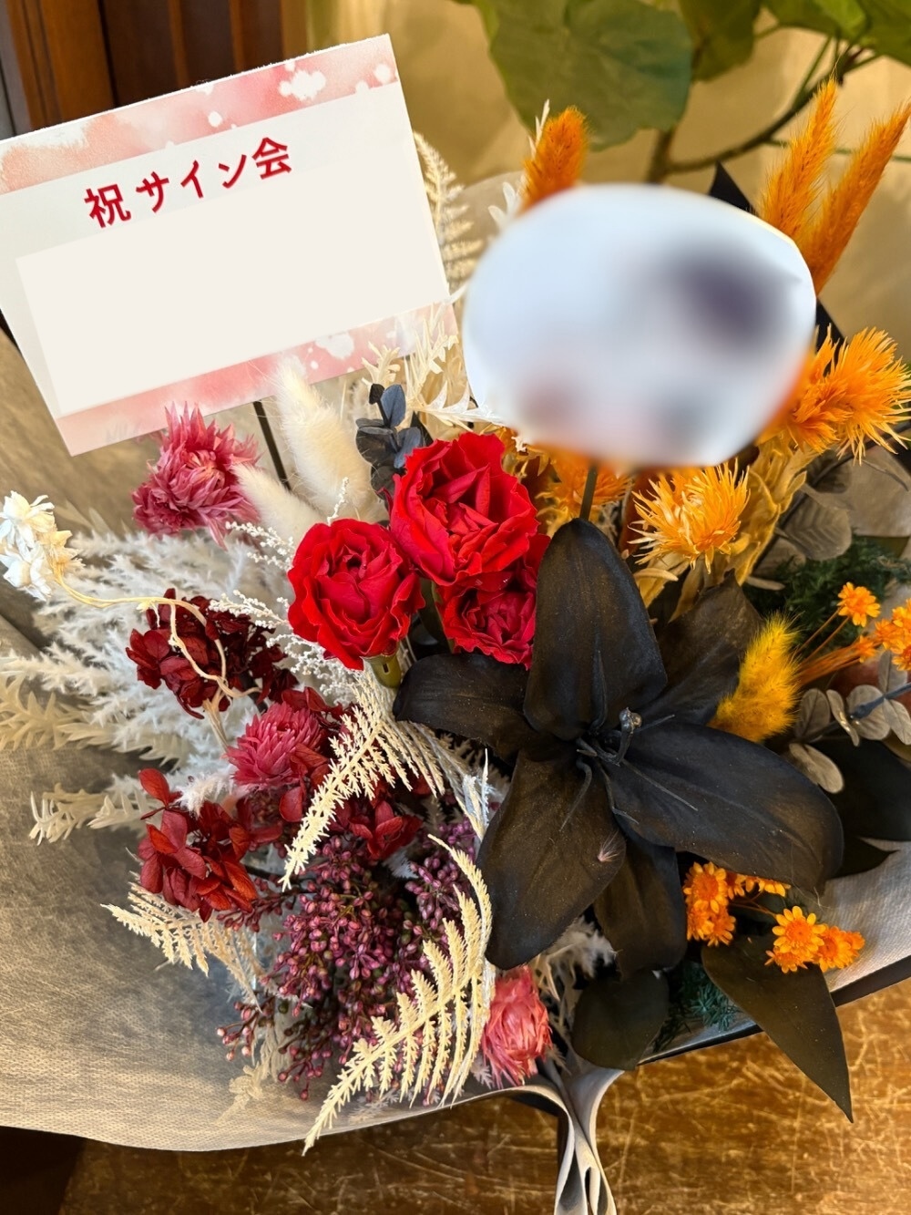 サイン会の祝花ということで、作家さんの描かれているキャラクターをイメージして作成いただきました。色味が強いオーダーだったのですが、可愛らしくしていただきたいとお願いしたところ、素敵な作品に仕上げていただけました。