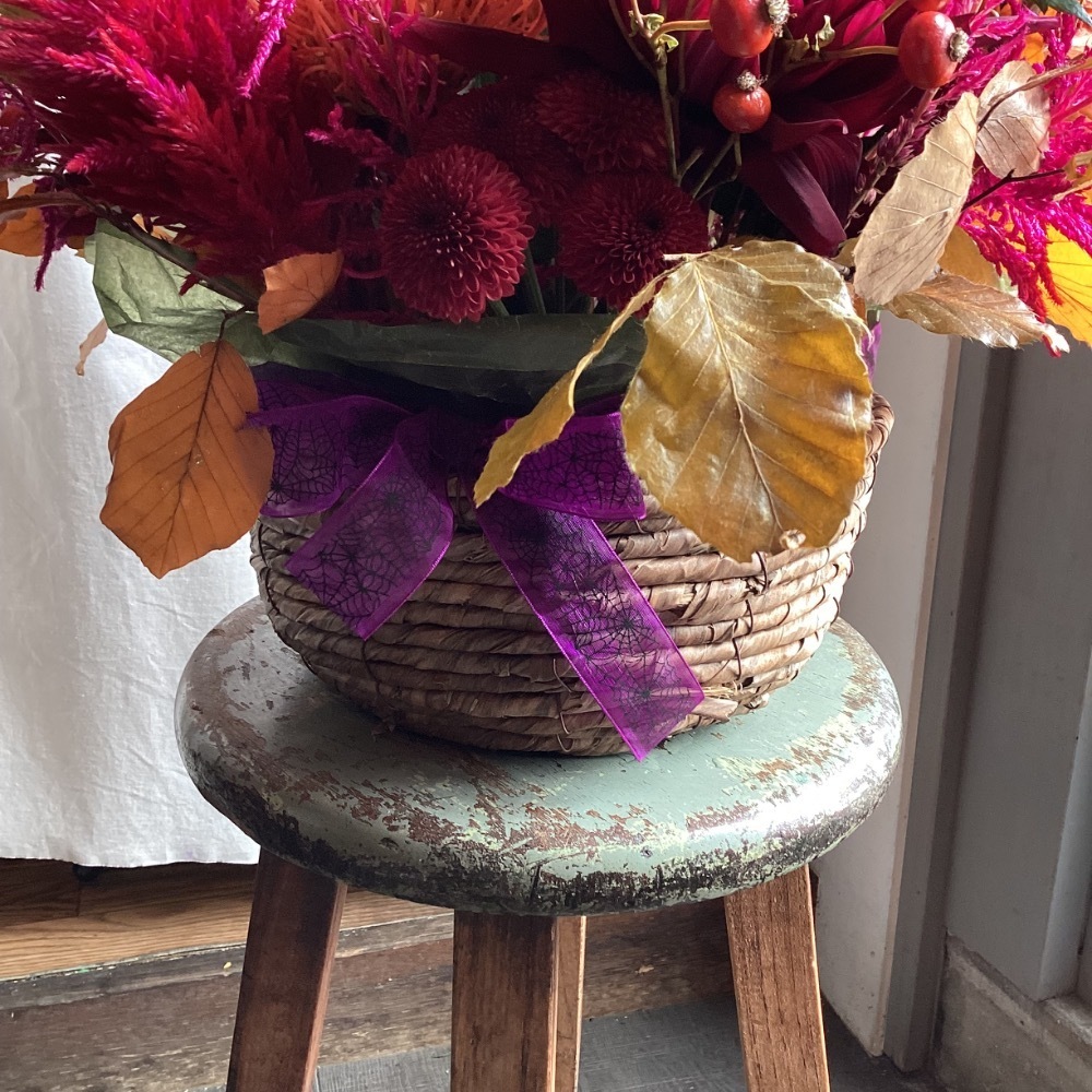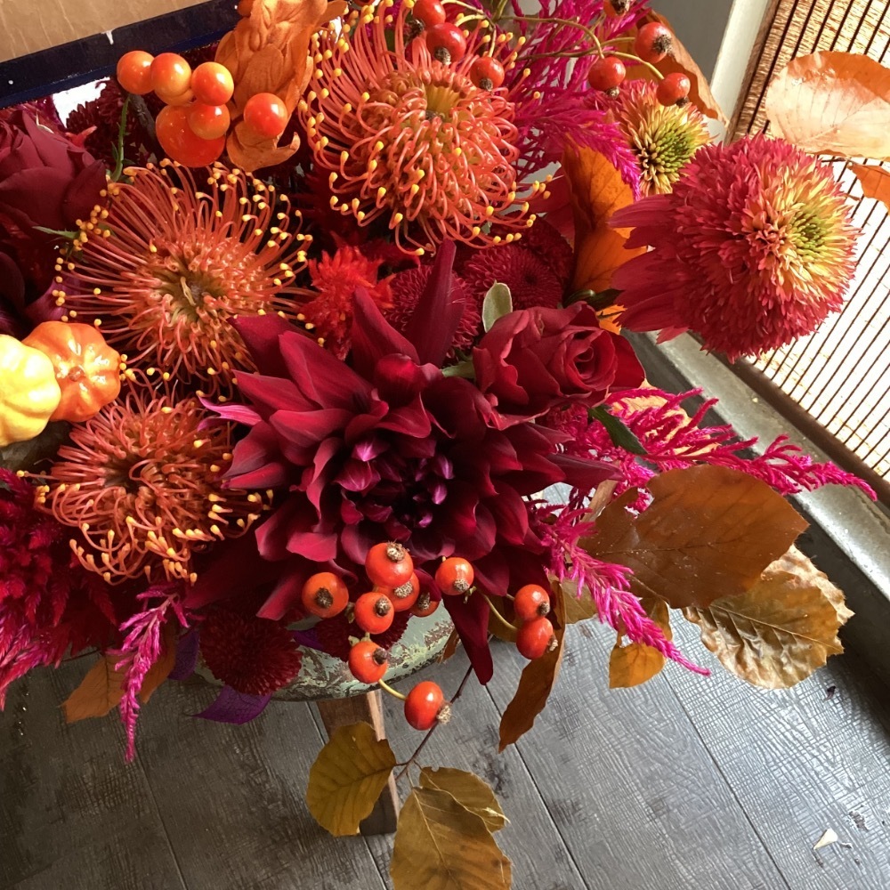 完成したアレンジは、秋の深い色合いが本当に美しく、こちらが用意した小さなカボチャを印象的に使ってくださっていて、とても嬉しかったです。