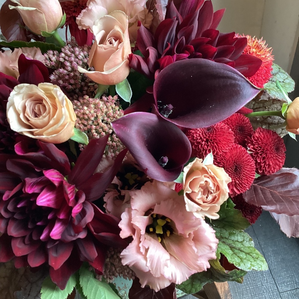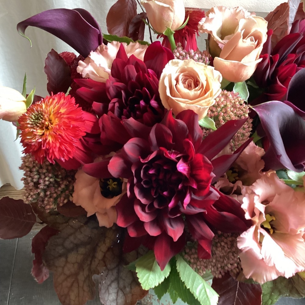 ダリア・黒蝶、バラ・カフェラテ、カラー・カントールなどをメインにお作りしました。