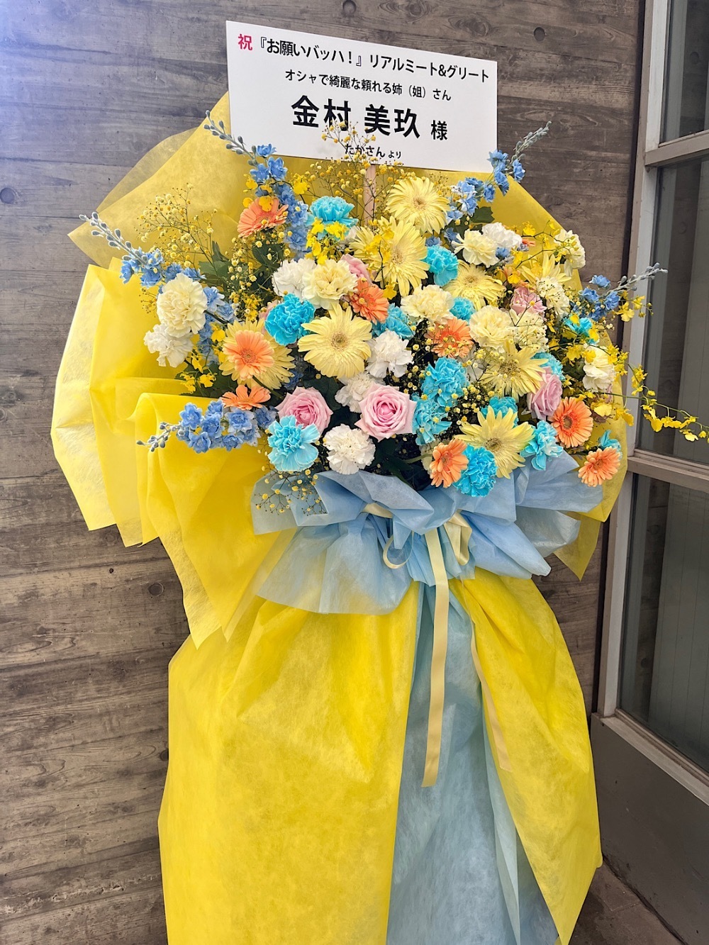 金村さんのペンライトカラーであるパステルブルーとイエローをベースに、23歳の大人の女性になった御本人に祝福が訪れるよう上品な雰囲気の祝花をオーダーさせて頂きました。