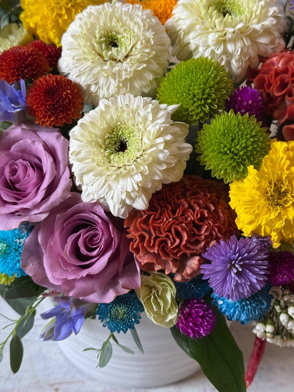 ご希望のカラフルな色合いで、アーチをおつけ致しました。 メインとなるのは八重咲きガーベラや、 バラ、カーネーション、マム、ケイトウ、アスター、唐辛子、スターチスなどです。