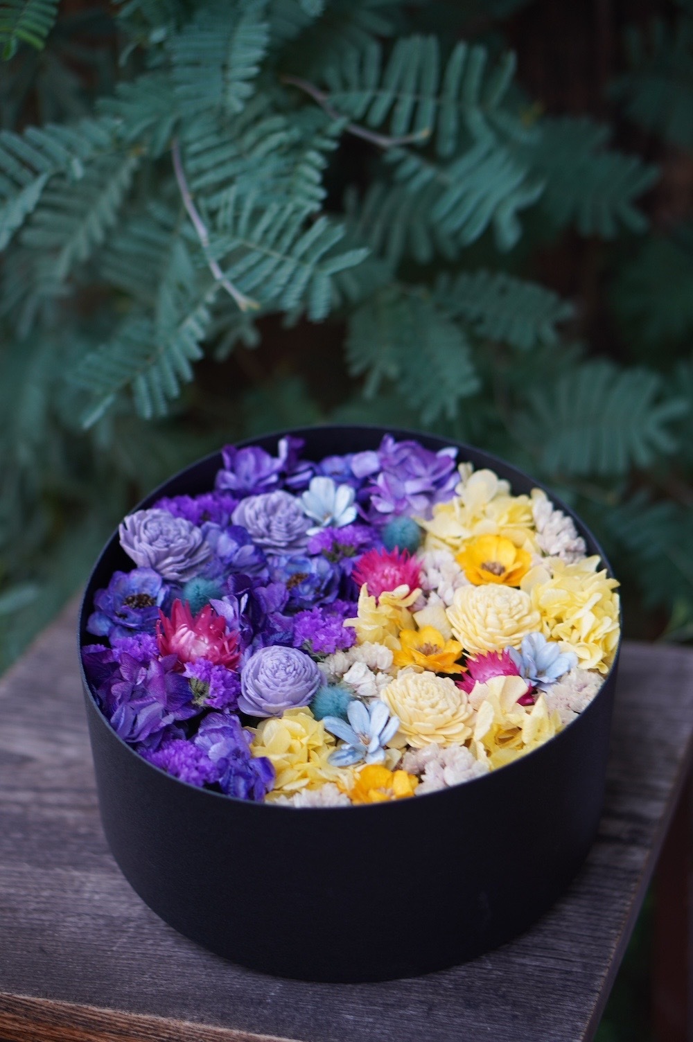 完成したお花は、頭の中で想像していたよりずっと目を引く素敵な色合いで、カラフルなお花が調和して1つの作品としてのまとまりがあって、プロの技に感動しました。