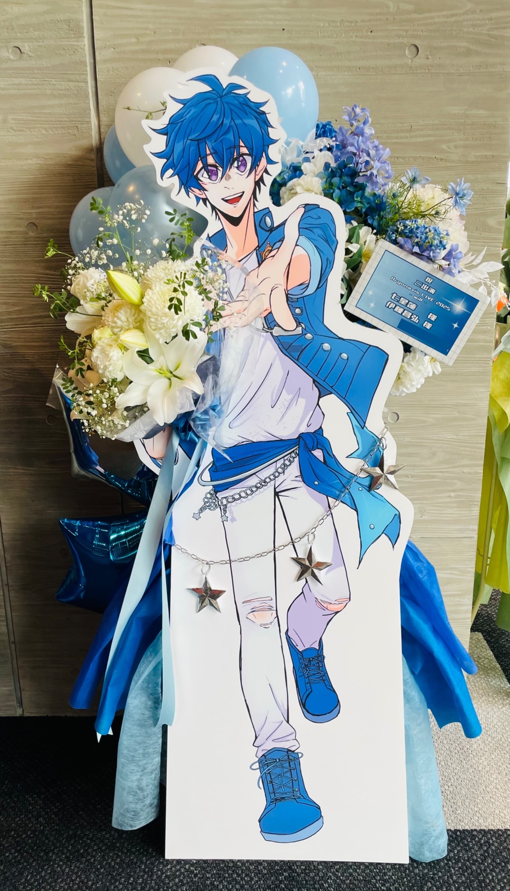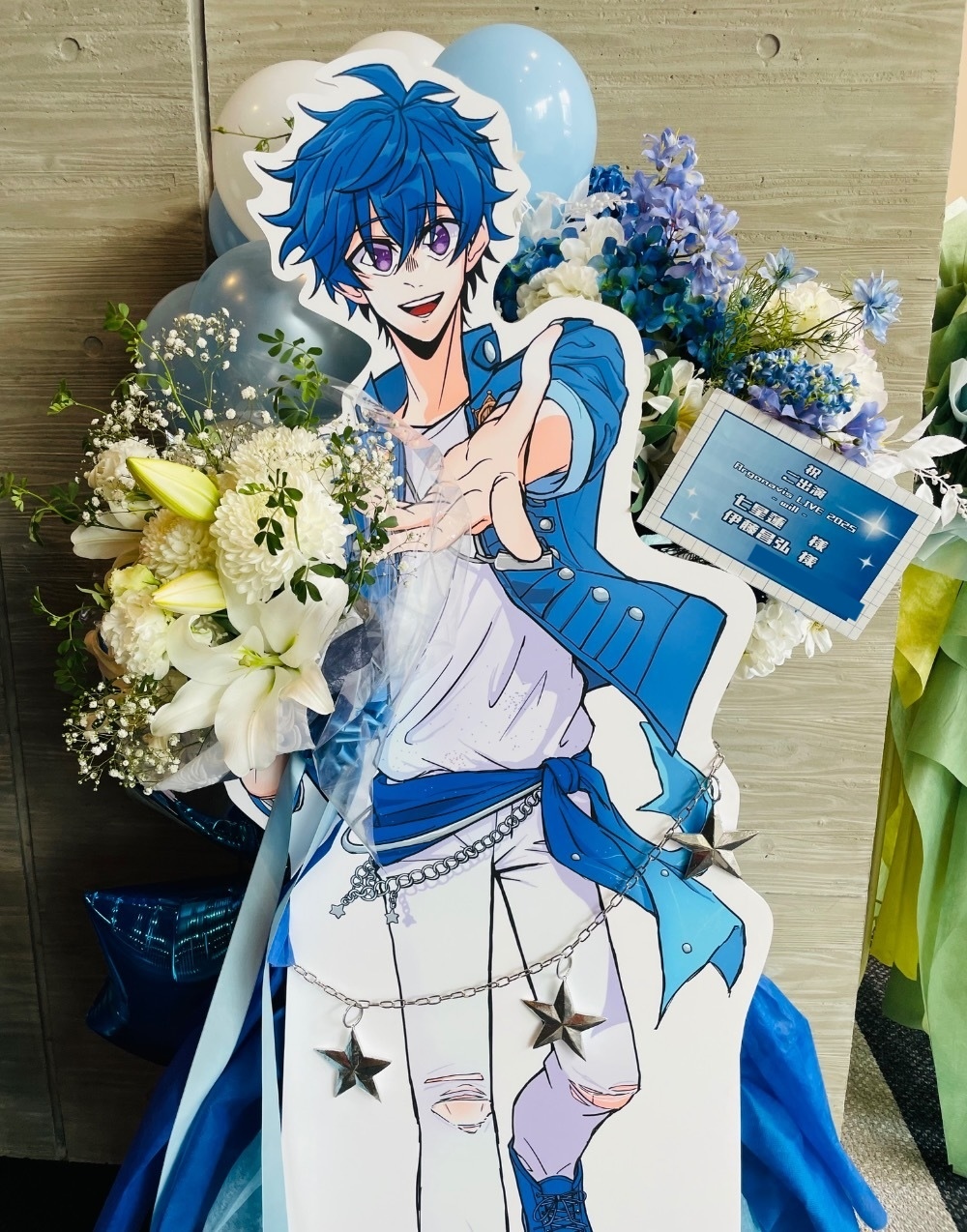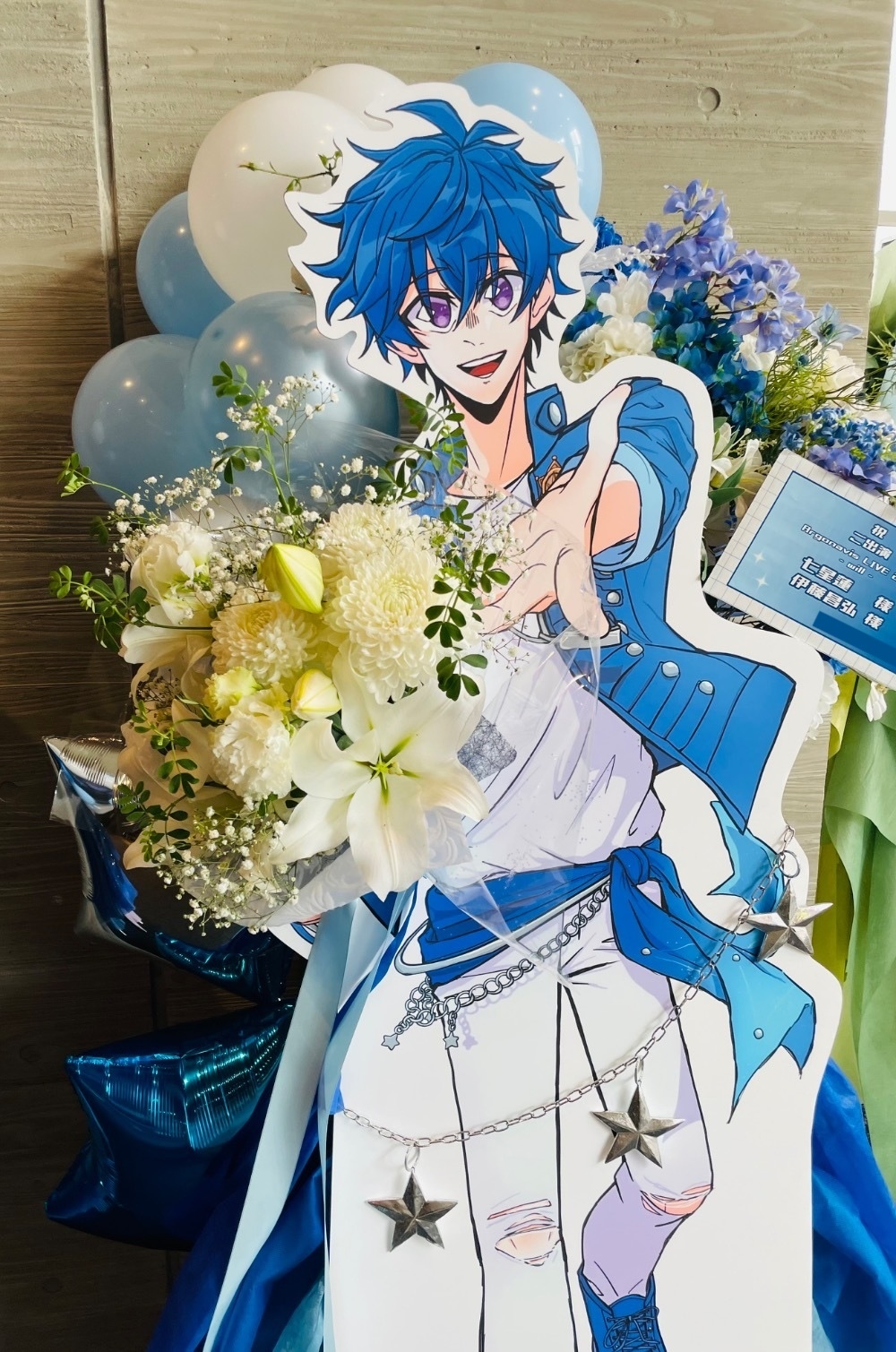 最後のワンマン開催をお祝いして、キャラの等身パネルに花束を持たせるようなイメージで注文させていただきました。