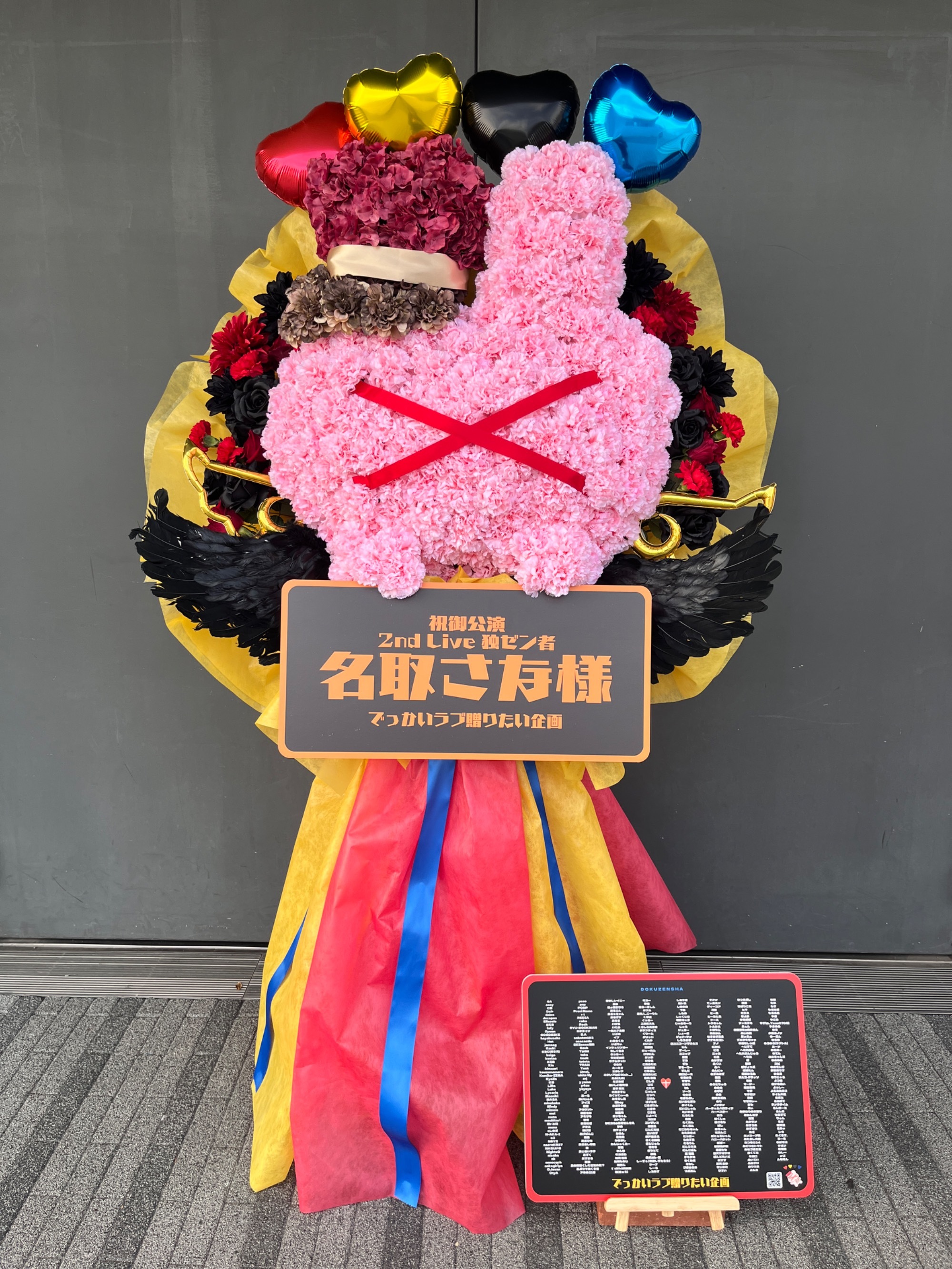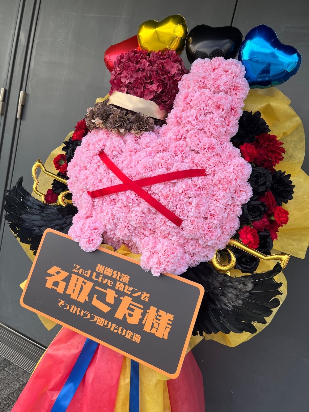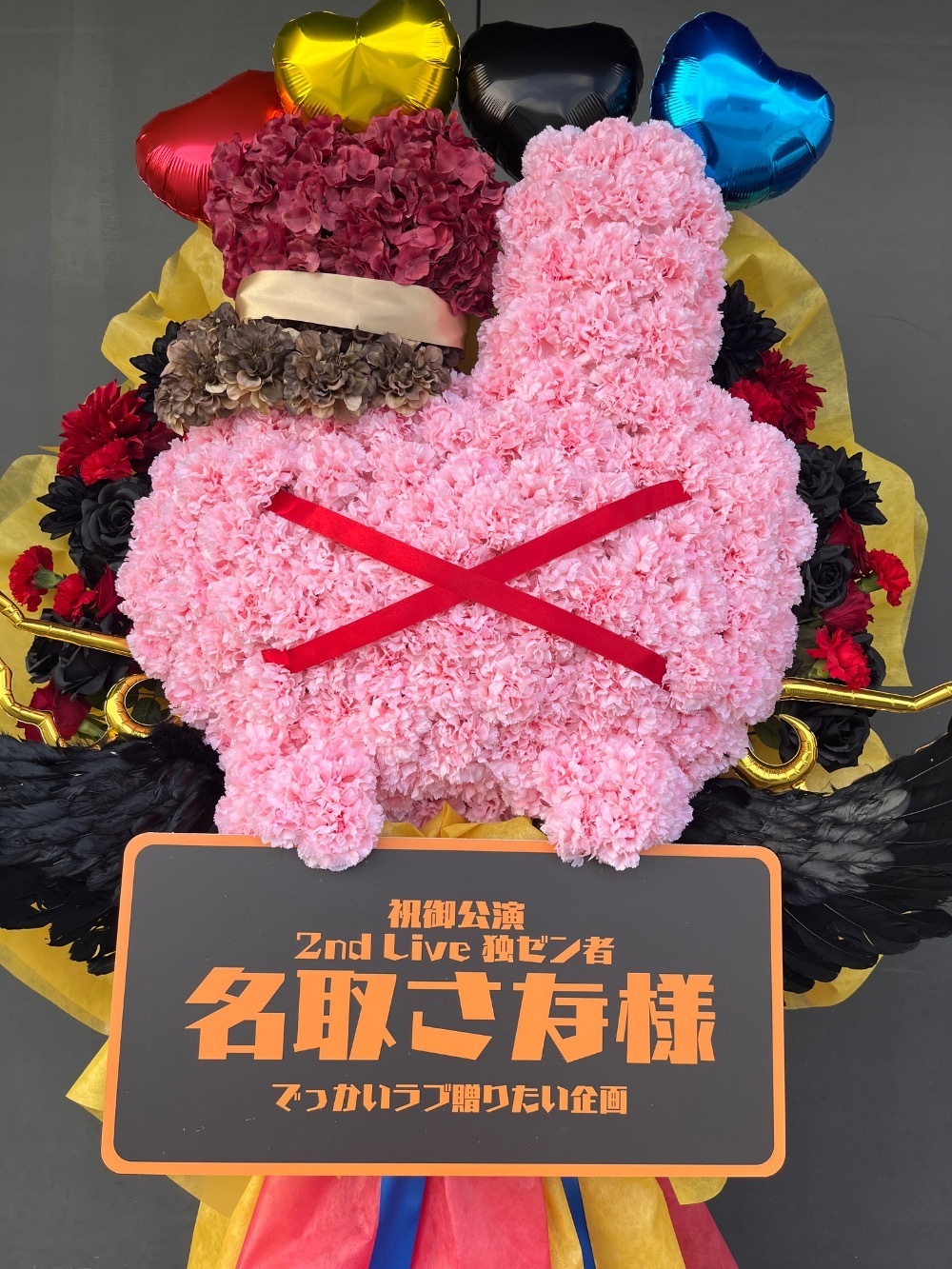 名取さんの2nd Live 「独ゼン者」のKVをモチーフにしています。名取さんのマスコットキャラのうさぎの顔のお花に、名取さんの新衣装の帽子を被せ、KVの配色をイメージしたバルーンや不織布を用いたシンプルなデザインを考えました。