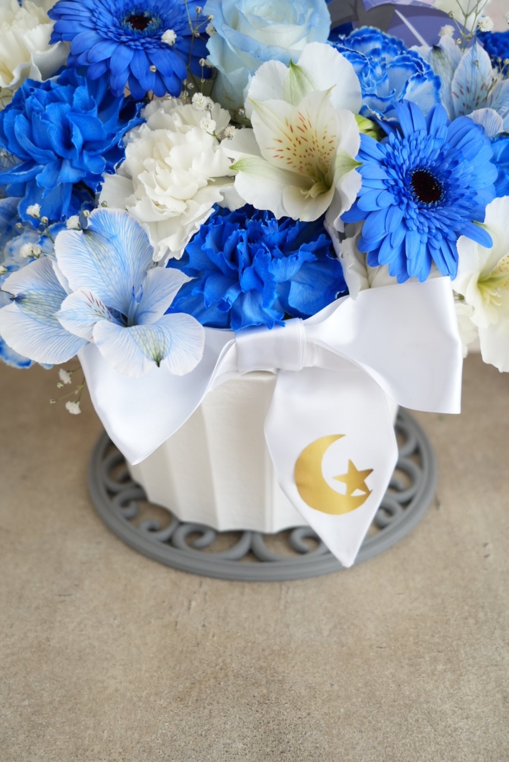 過去にあったお月見イベントのモチーフをイメージし色は個人カラーの青とユニットカラーの白を使用、中央水色のバラも本人モチーフのため入れてもらい