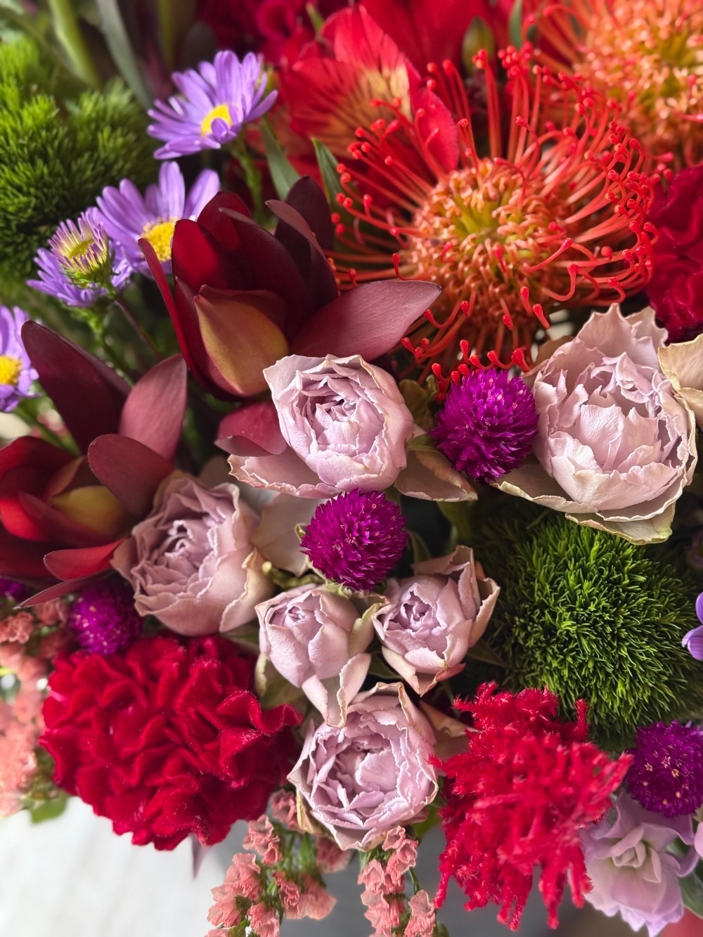 赤紫系でシックでいて華やかなアレンジに仕上げました🌹