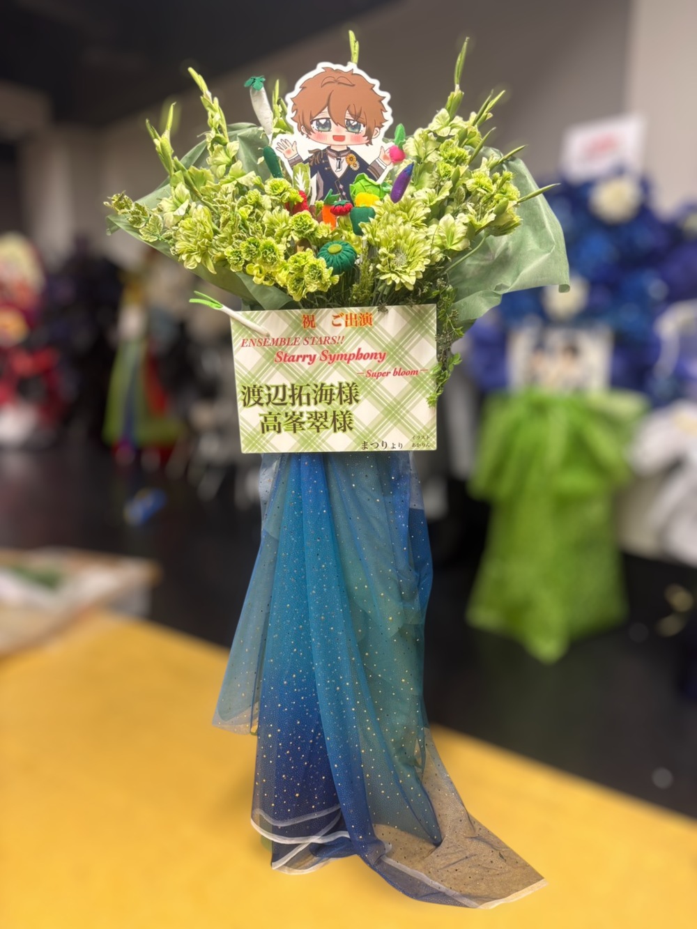 八百屋の息子というキャラクターに合わせて急遽野菜の装飾品も追加して一緒に飾ってもらったおかげでとても可愛いフラスタに仕上がりました。