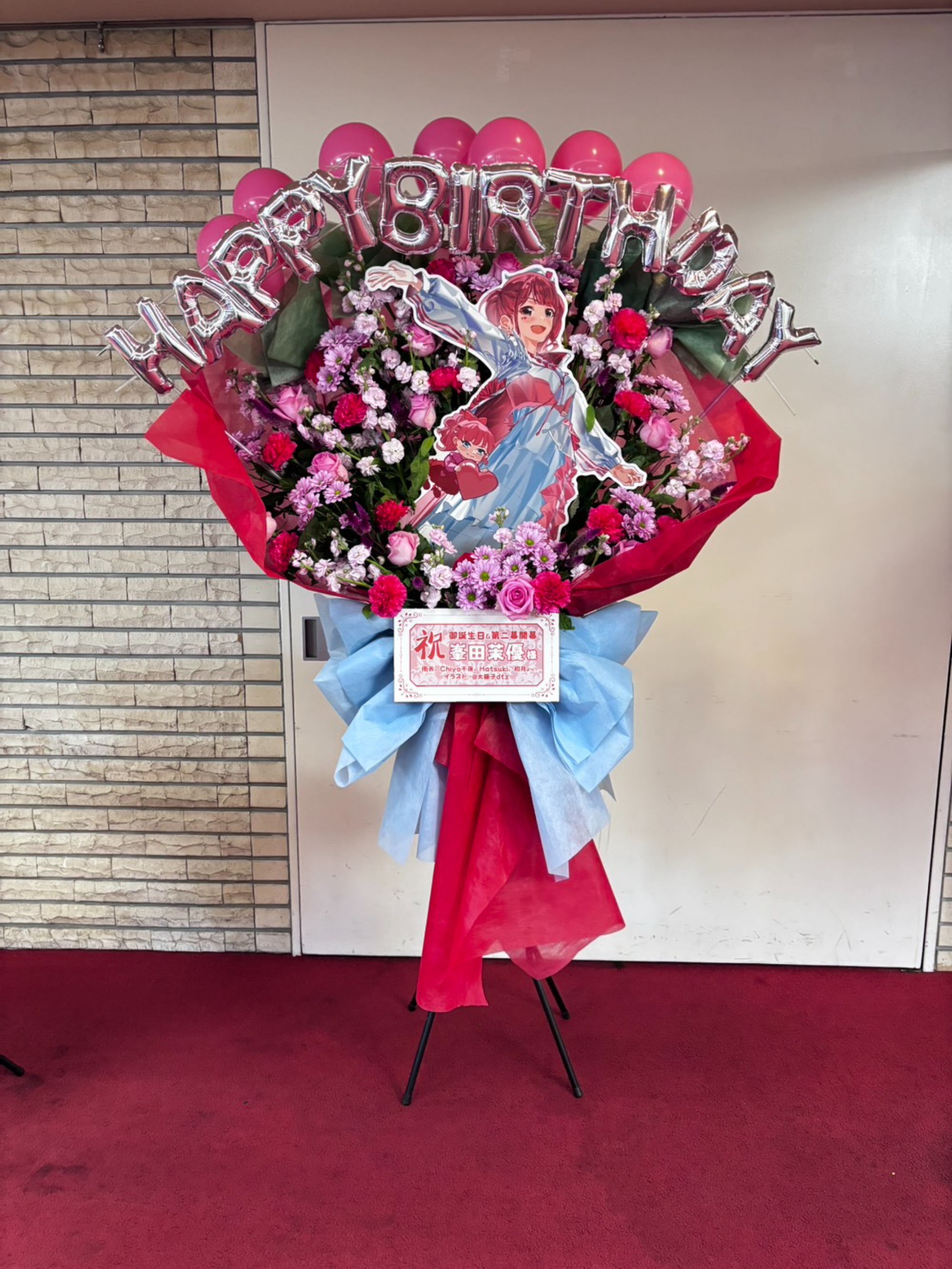 #35,000円-50,000円 #公演・出演祝い #フラワーデザイナー金巻 #ピンク #スタンド花 #推し花 #TOKYO FM HALL #峯田茉優 #声優 #オリジナル立て札 #パネル装飾 #バルーン #花束風フラスタ
