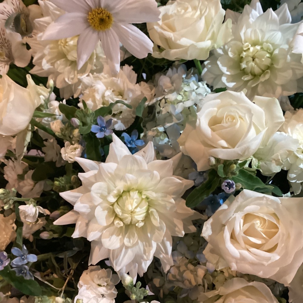 出演者様のイメージカラーである深縹色と髪色の白を基調にお花を仕上げていただき、お好きなブルースターもアクセントとして加えていただきました。