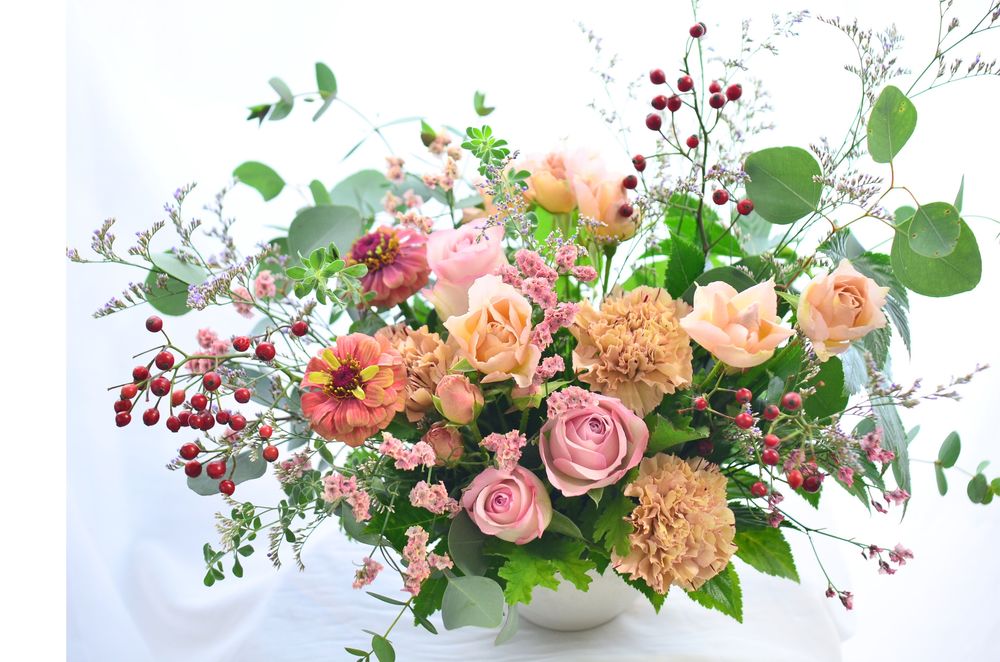 季節のお花で作るアレンジメント。高さは抑えめに、テーブルやカウンターなどに飾る場合がお勧めです。色合いはオーダー時にお申しつけください。