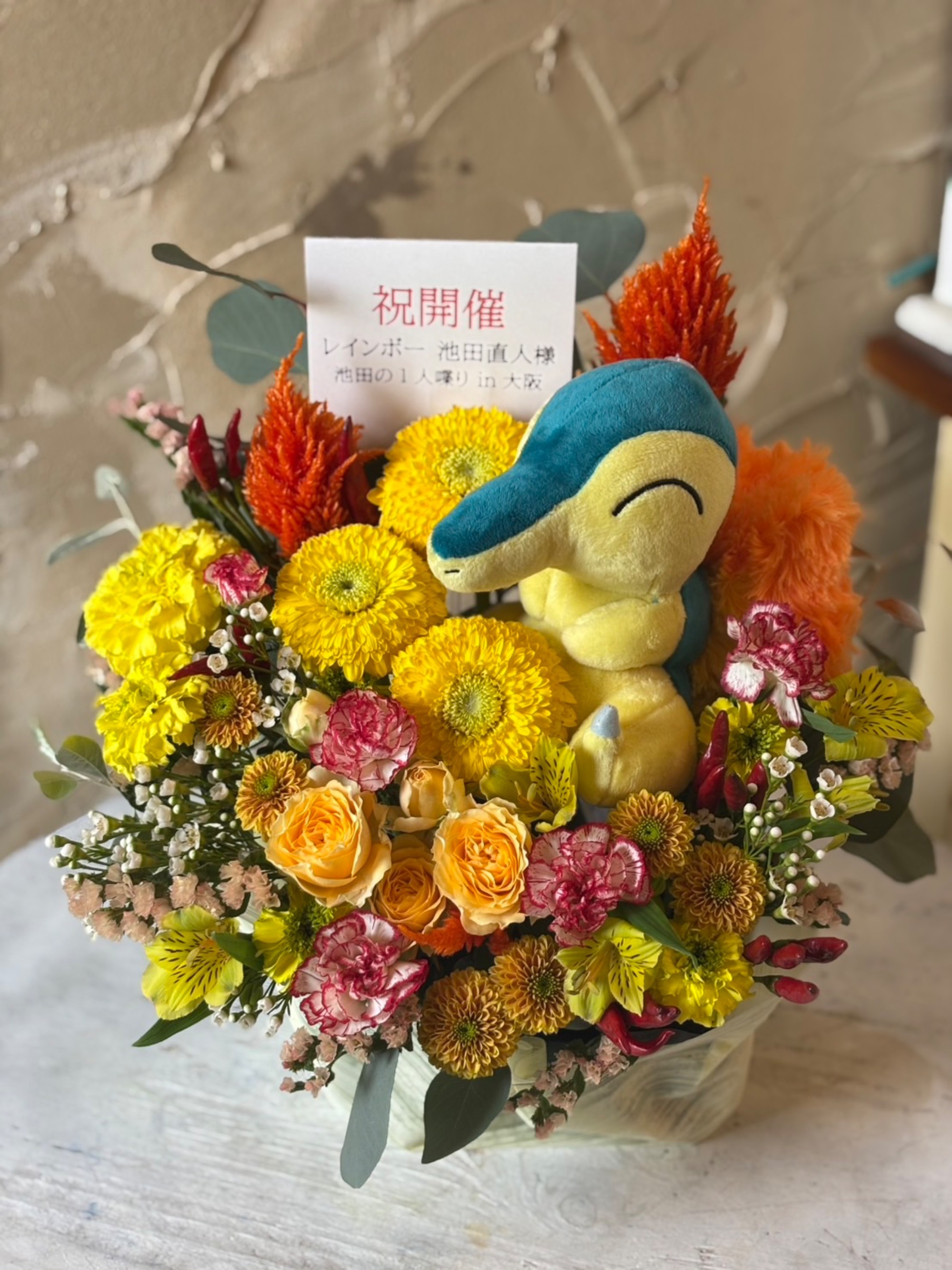 #6,000円-9,000円 #公演・出演祝い #フラワーデザイナー牧 #黄 #楽屋花 #推し花 #よしもと道頓堀シアター #レインボー池田 #芸人 #ぬいぐるみ