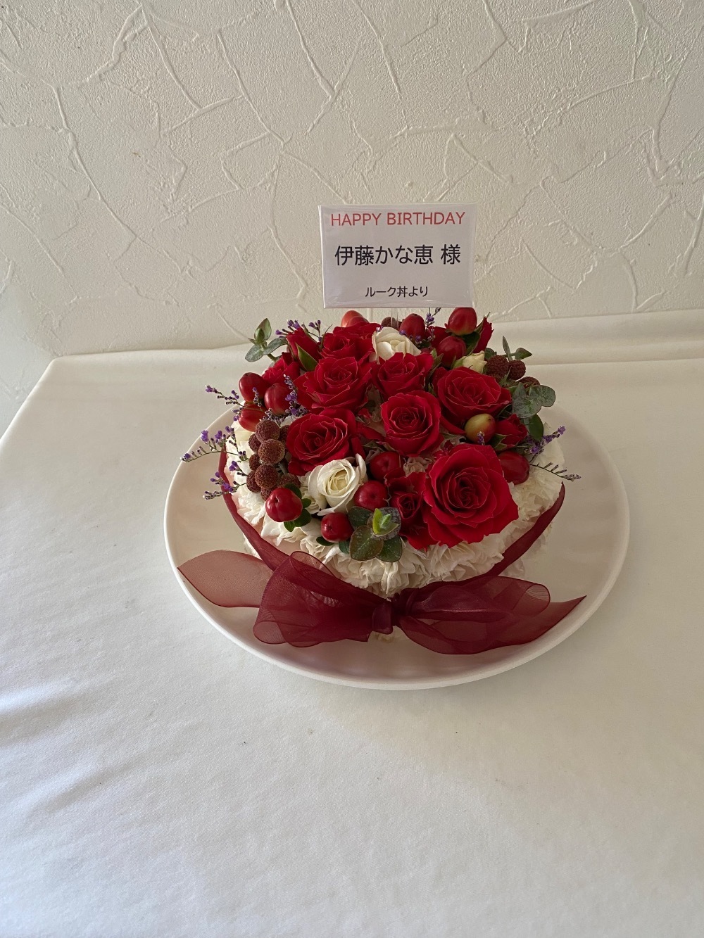 誕生日当日のお祝いということでお花はメインに白、ほかに赤、ピンクを織り交ぜようと思い、