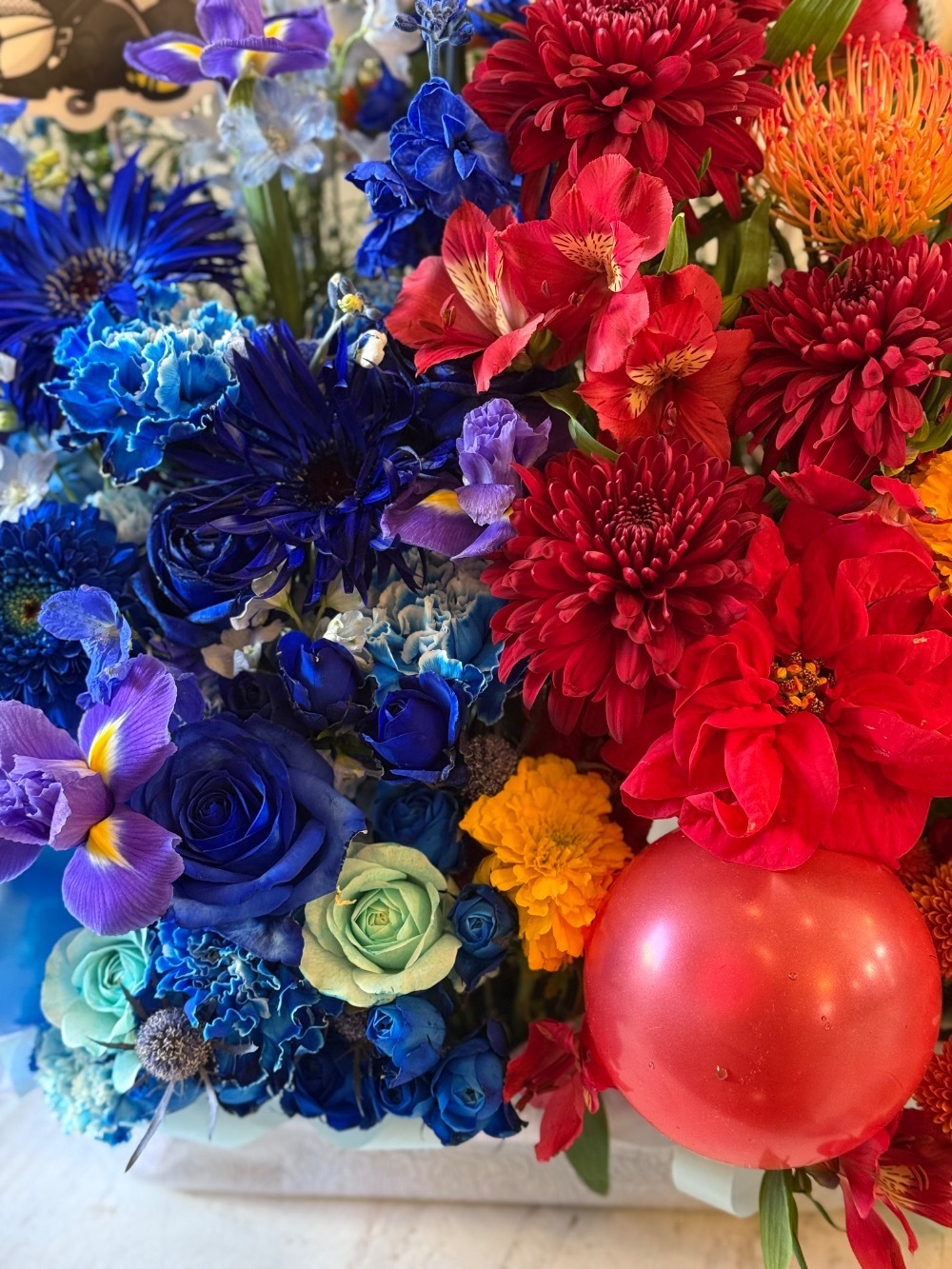 #16,000円 #公演・出演祝い #フラワーデザイナー牧 #ブルー #楽屋花 #推し花 #COMTEC PORTBASE #モリスレイ #はへー #パネル装飾 #バルーン #ツートンカラー #赤