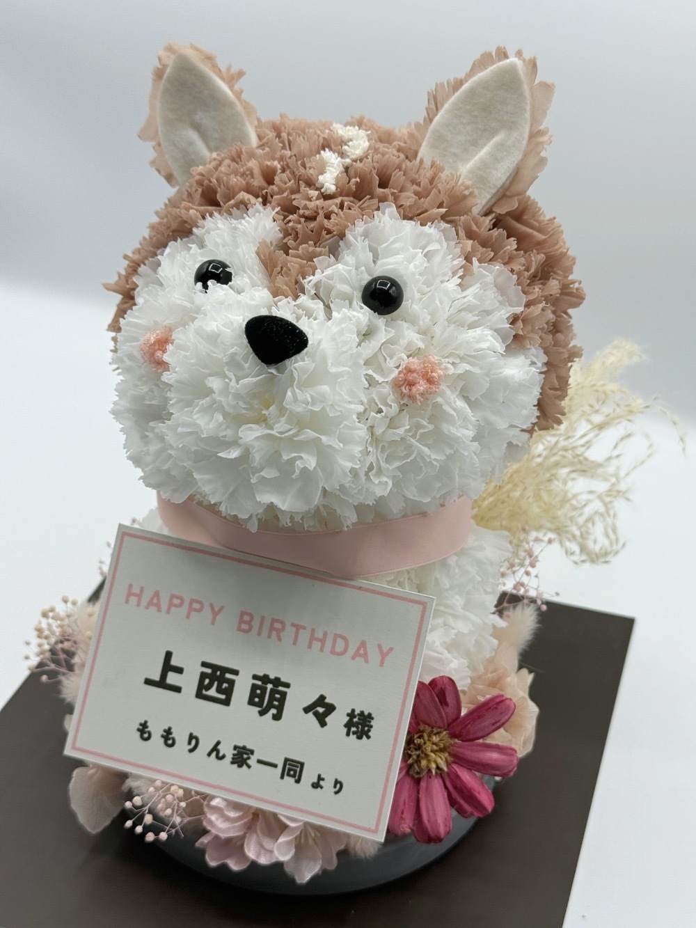 お送りいただいたワンちゃんモチーフのお花を制作しております。