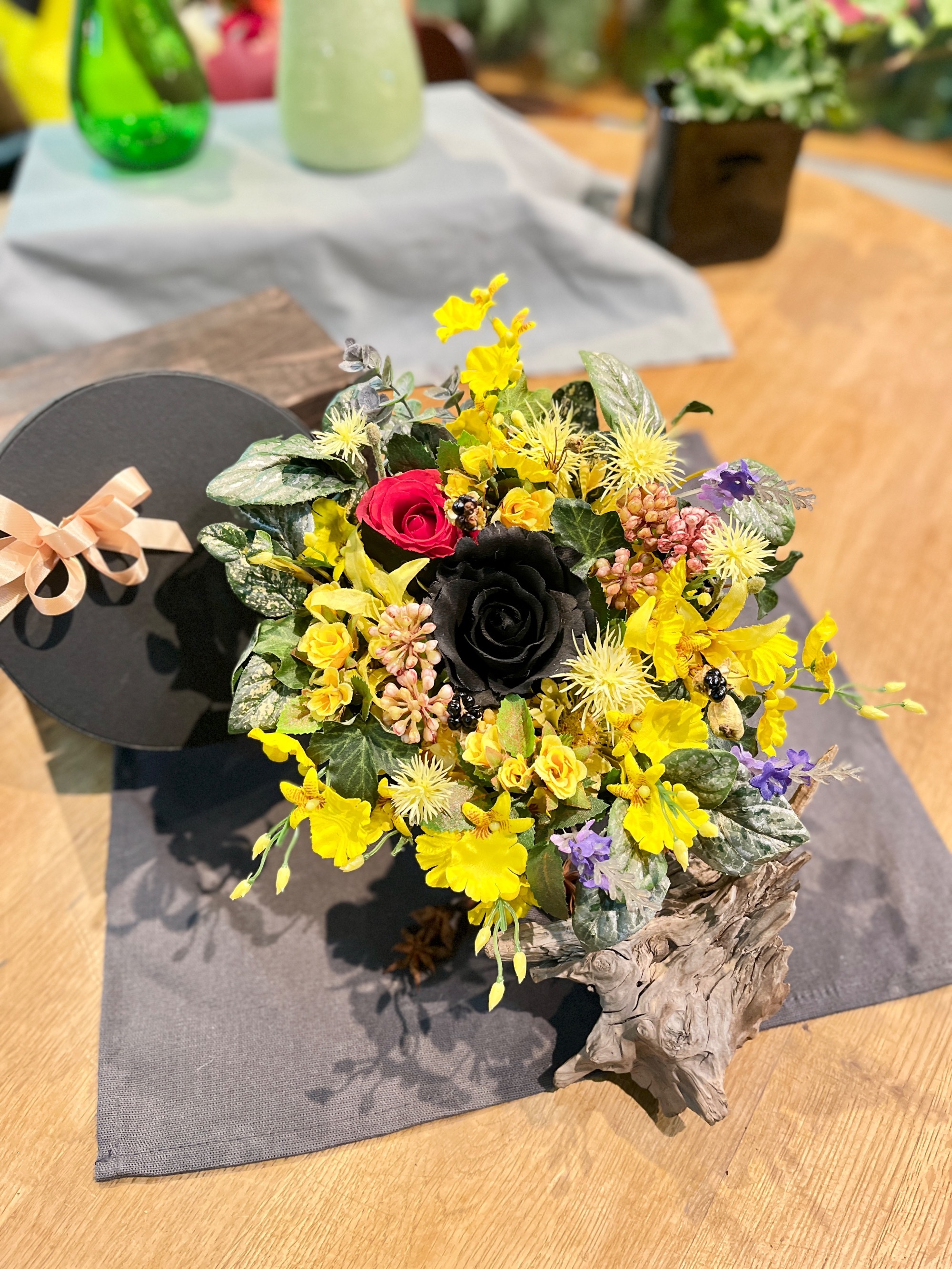 メンバーカラーの黒と黄色をメインに、悠佑さんの好きな色の赤色の花を1輪入れていただきました。