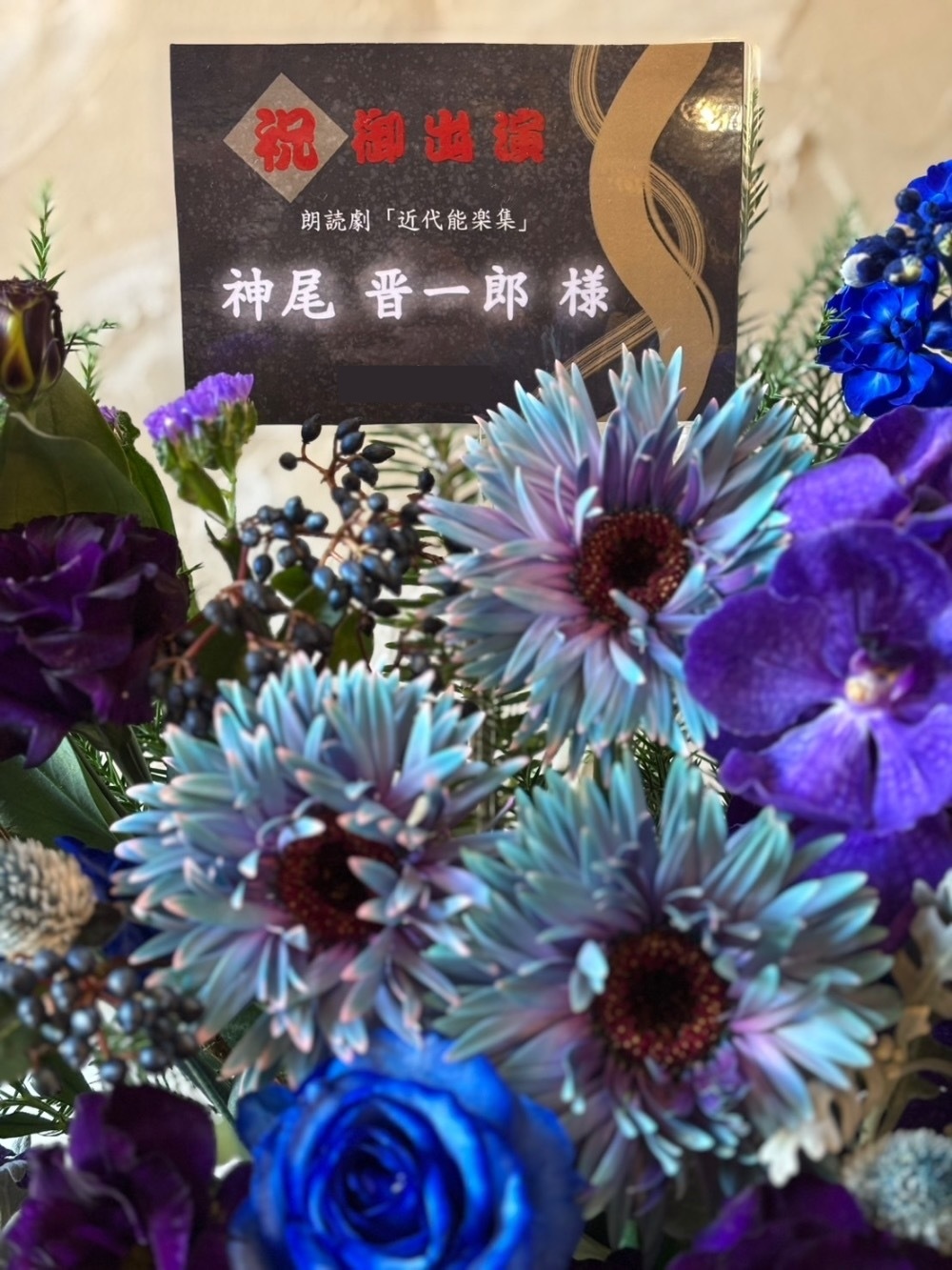 #6,000円-9,000円 #公演・出演祝い #フラワーデザイナー牧 #ブルー #楽屋花 #推し花 #新国立劇場 #神尾晋一郎 #声優 #俳優 #オリジナル立て札
