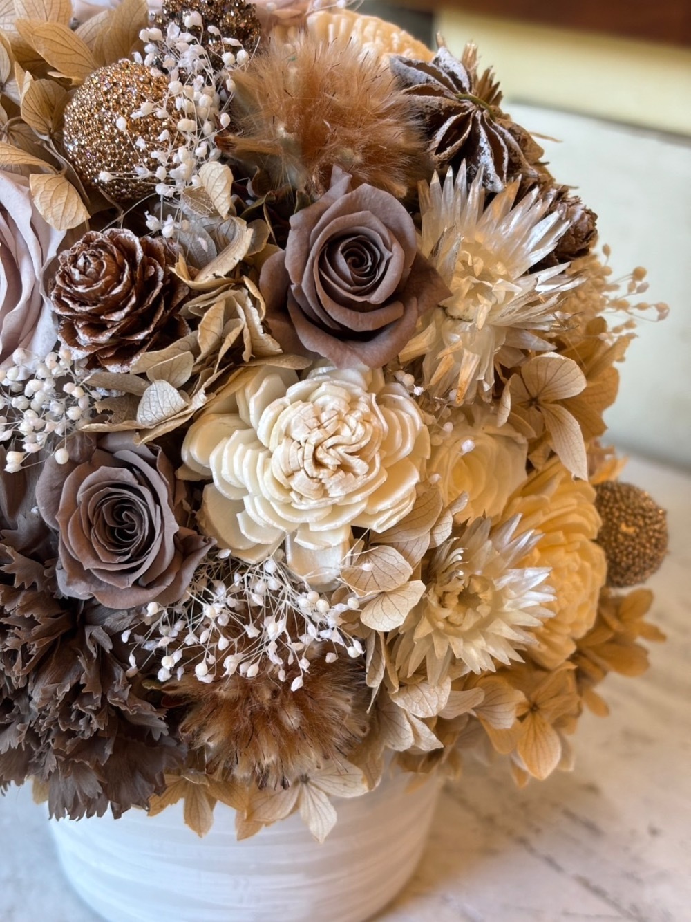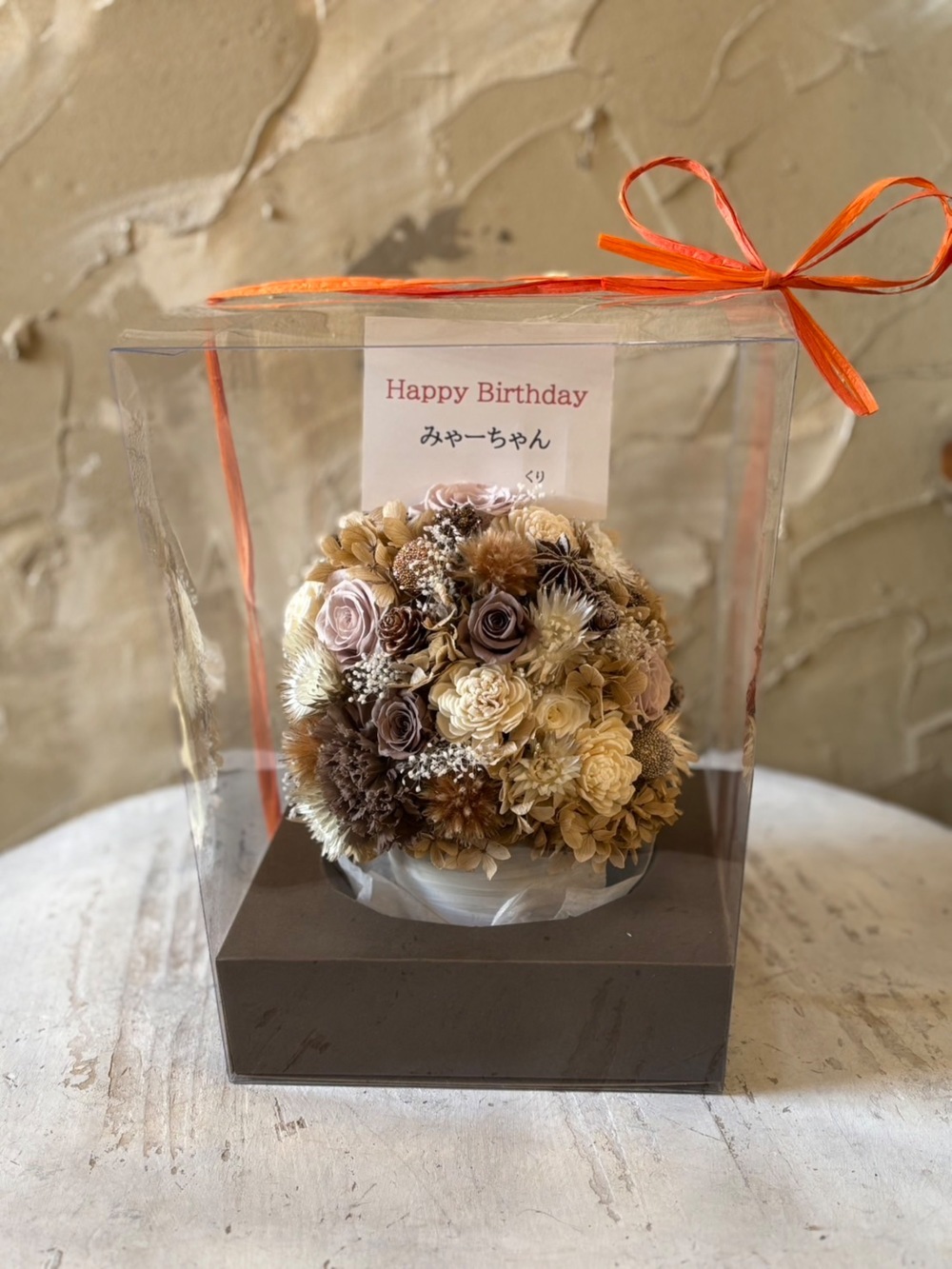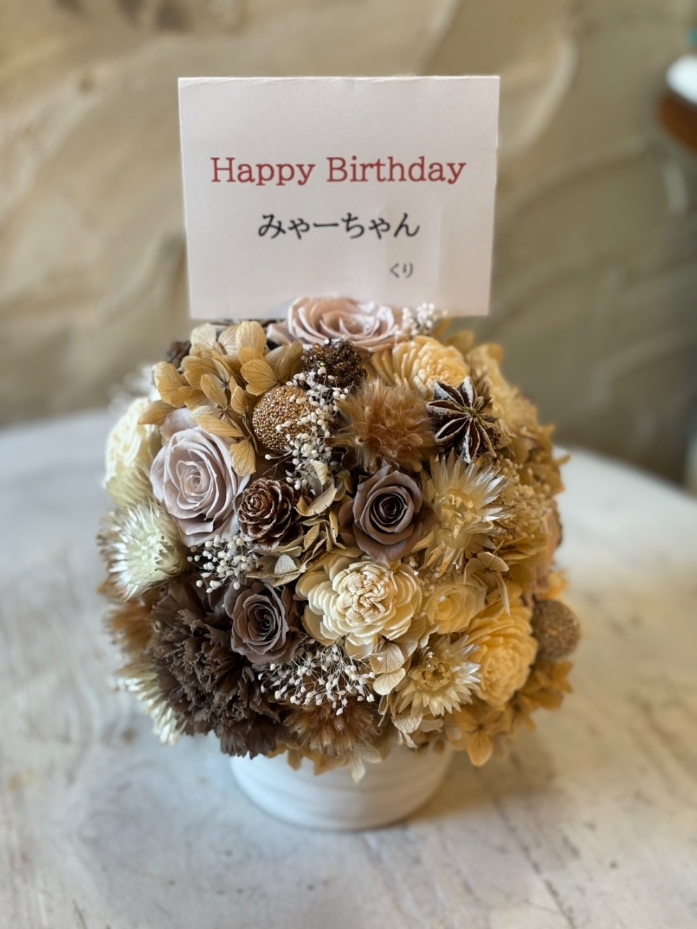 湊みやさんのお誕生日をお祝いするお花を制作いただきました。 マロンクリーム色を基調に、柔らかな白色を添えた仕上がりをお願いしました。