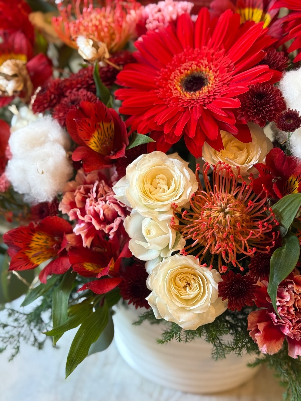 赤と緑と白のクリスマスカラーを使っていただき、なかでも赤いガーベラが目を引く、素敵なアレンジメントにしていただけました。