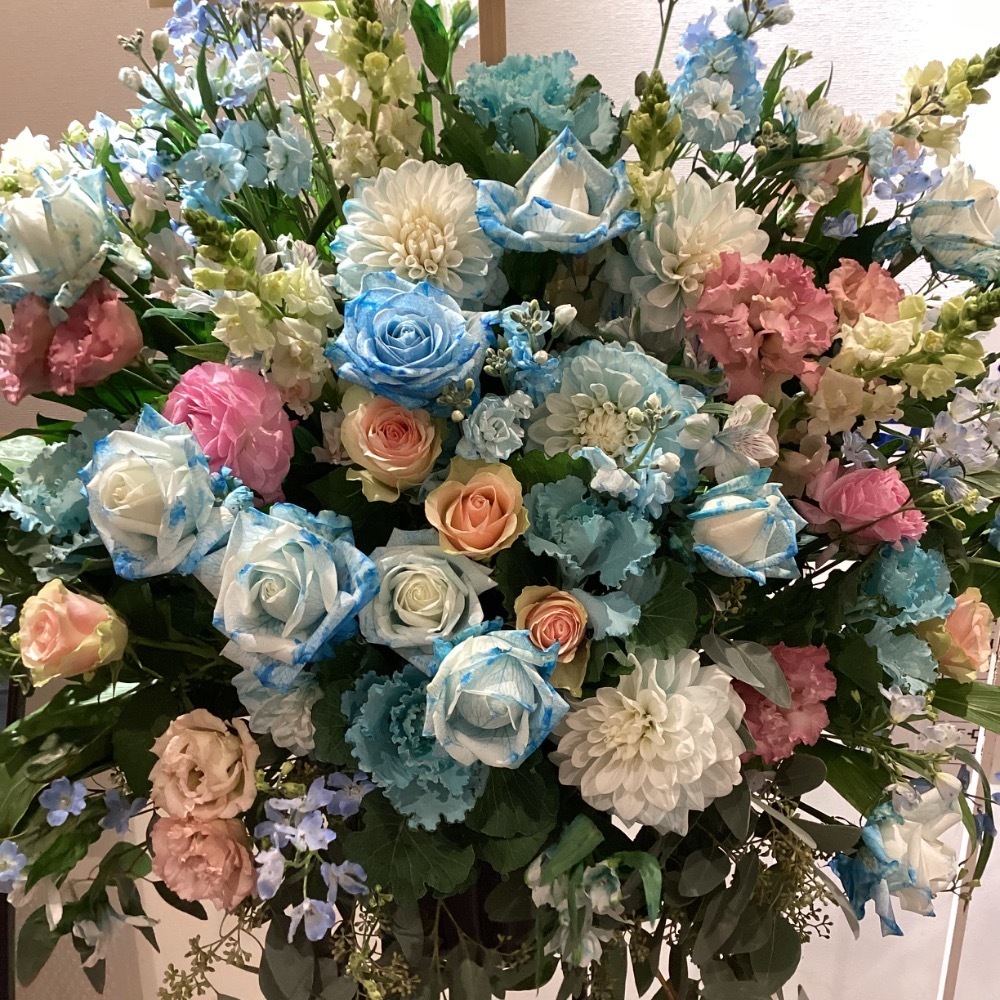 出演者お二人のブルーの衣装をメインカラーにしつつ、私の好きなピンクのお花も合わせて、お二人のカラーと自分の好きな色のコラボを楽しめる、華やかで明るい雰囲気に仕上げていただきました。