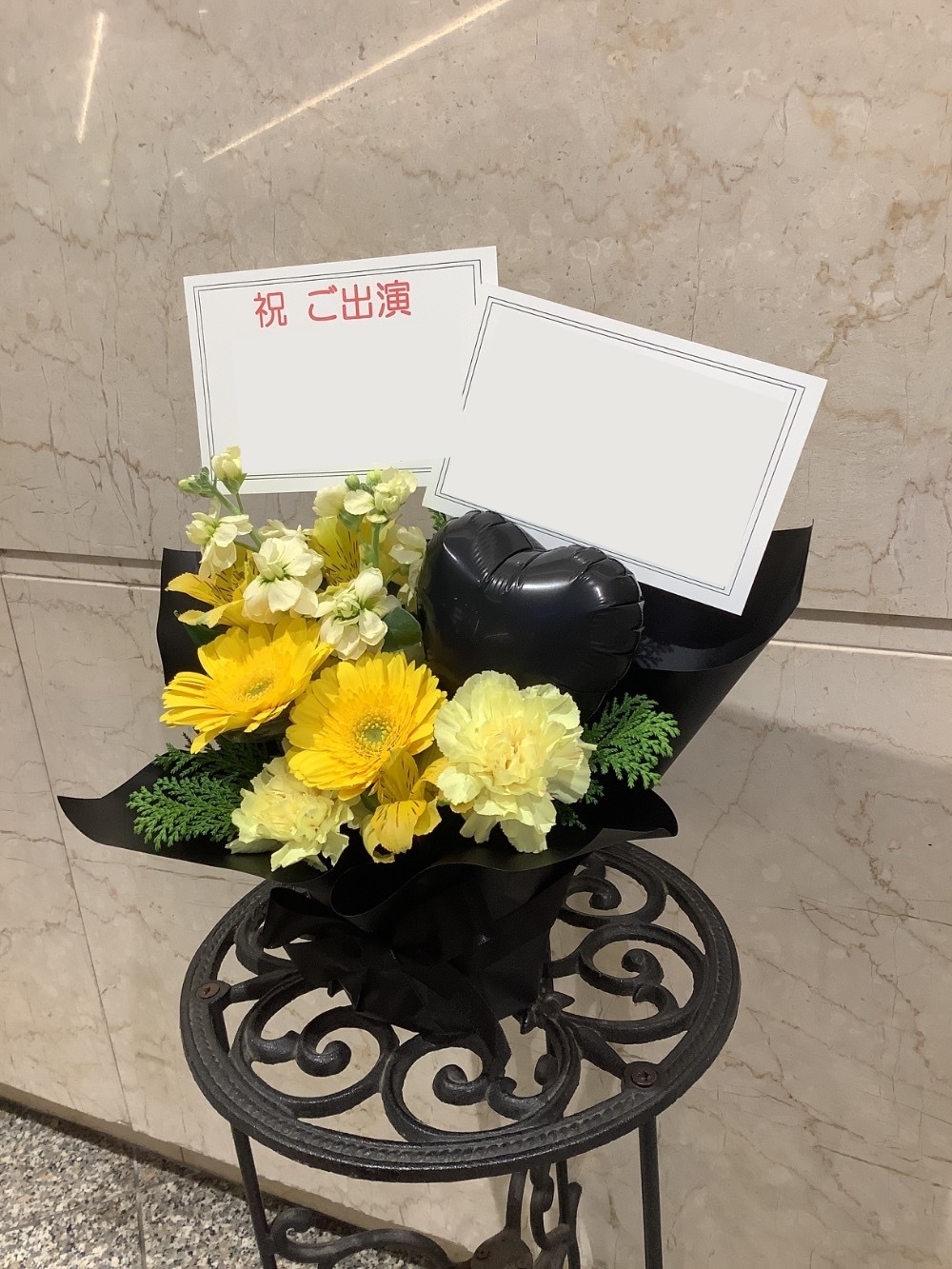 黒と黄色のイメージカラーでおまとめしたご出演祝い花・楽屋花