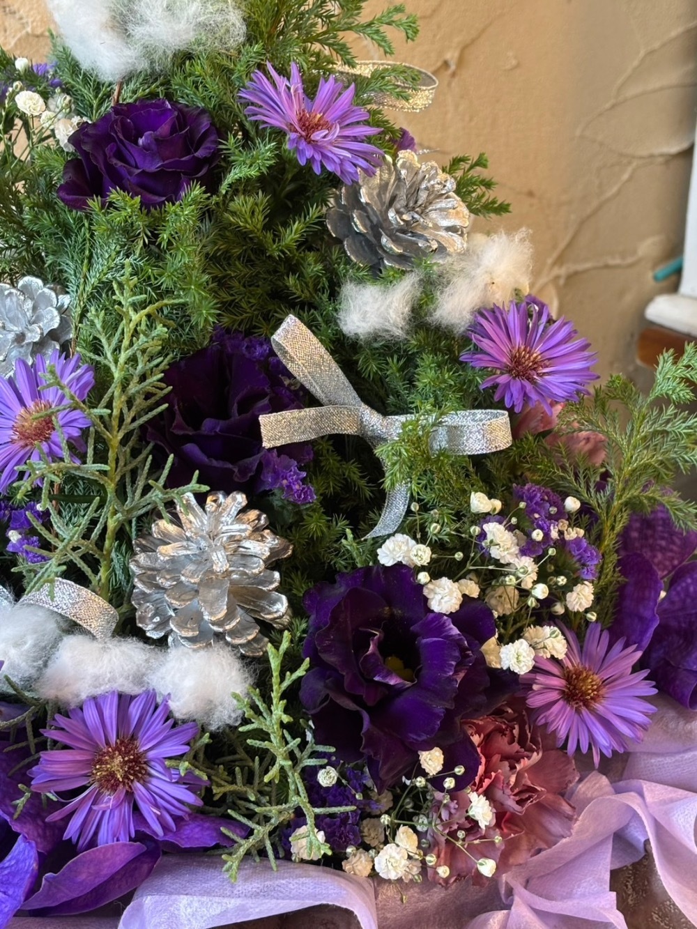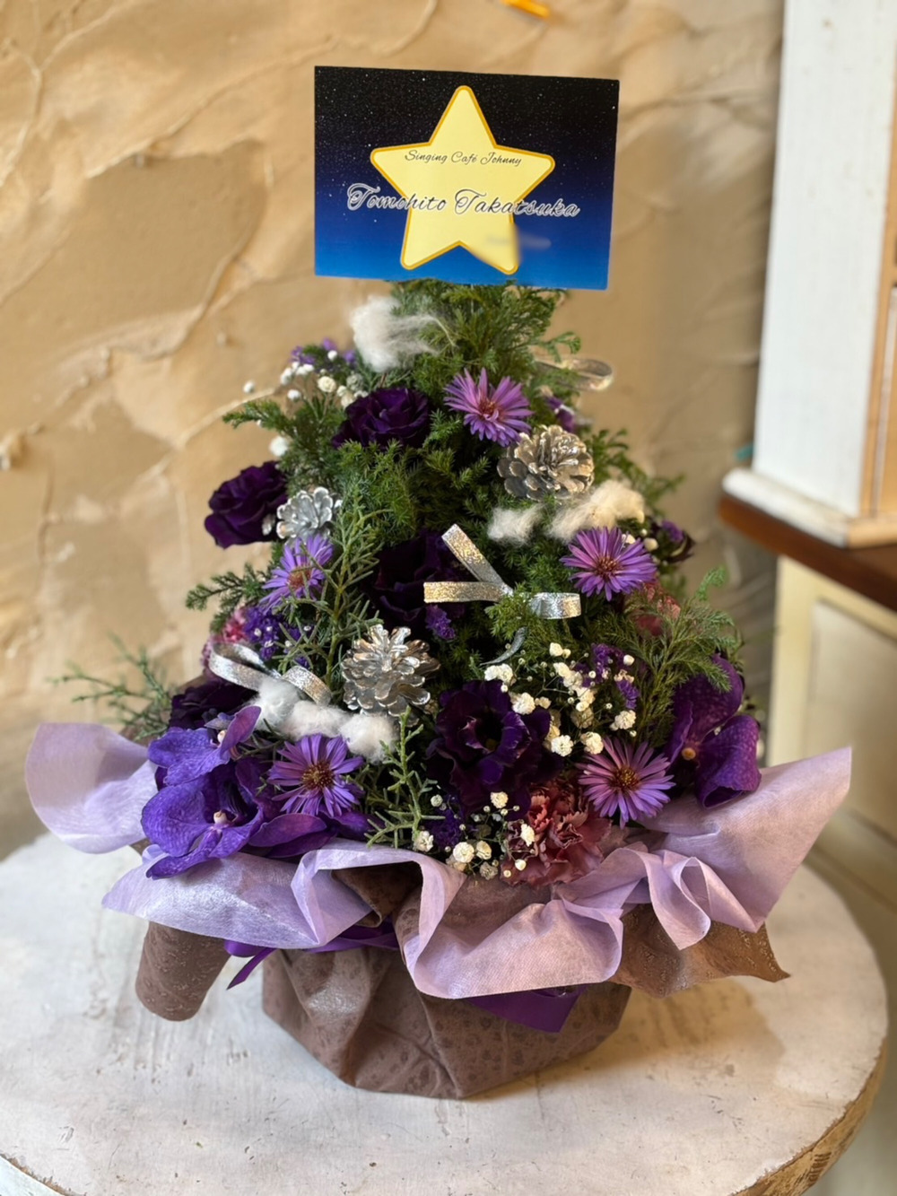ご本人の好きな紫を取り入れたクリスマスツリーをイメージしたお花に仕上げていただきました。