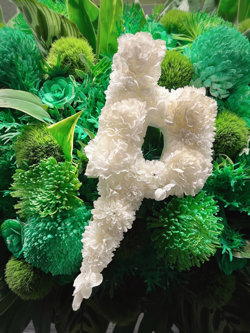 頂いた画像の白いロゴを別で作成しセンターに、周囲はグリーンでロゴが目立つよう作成させて頂いております。 喜んで頂けますように✨ 使用花材→ ロゴ(造花) ピオニーマム ディスバットマム 葉牡丹(4種類) ドラセナ カラテア モンステラ