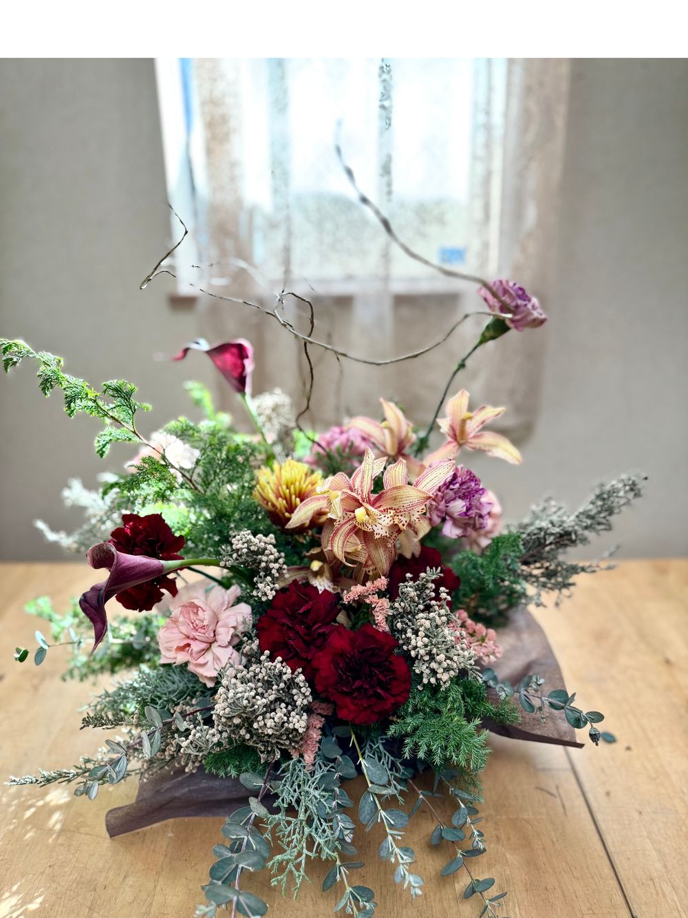 深みのあるボルドーやアンティークカラーの花々を中心に、