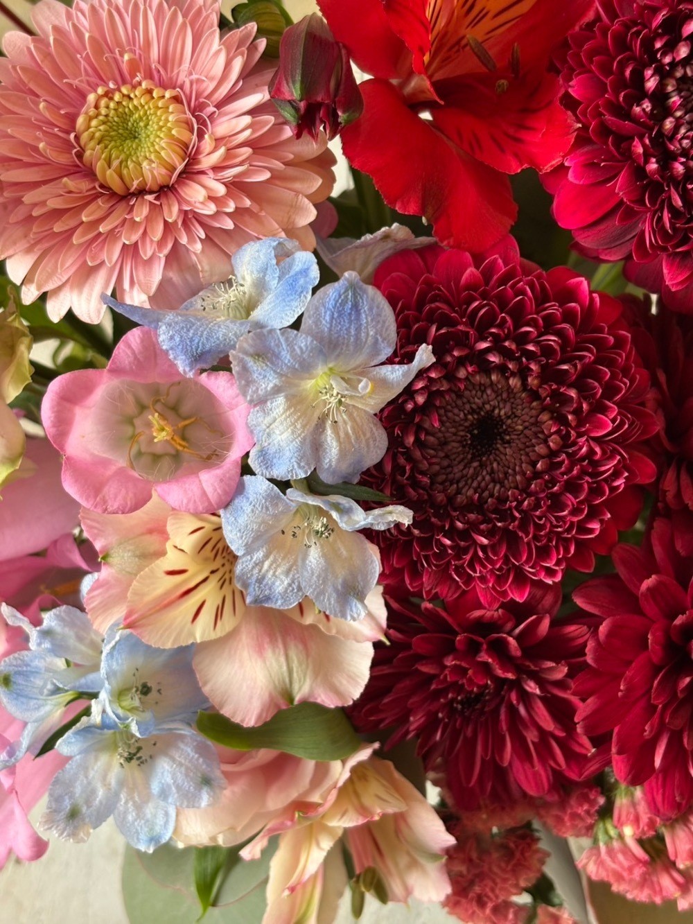 ご希望の色合いでまとめております。 主なお花は、八重咲きガーベラ、バラ、デルフィニウム、カンパニュラ、スターチス、ストックなどです。