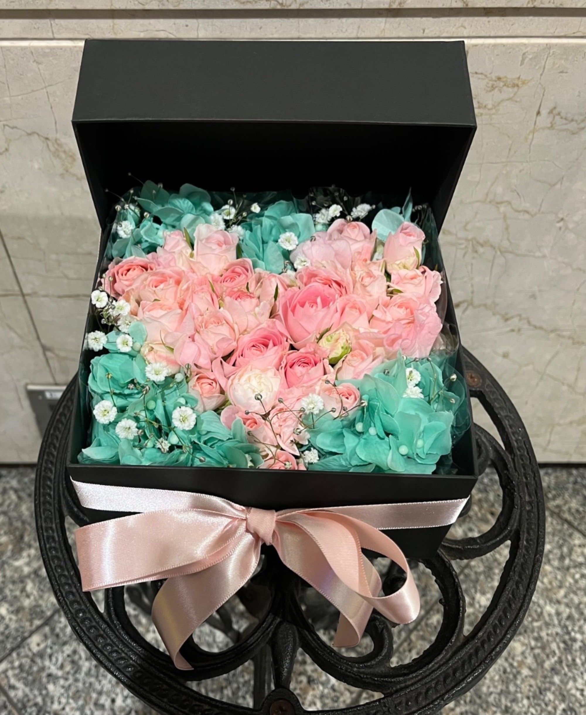#6,000円-9,000円 #公演・出演祝い #フラワーデザイナーかわむら #ピンク #楽屋花 #推し花 #渋谷スターラウンジ #穂乃香 #リボン #ボックスフラワー #ハート型