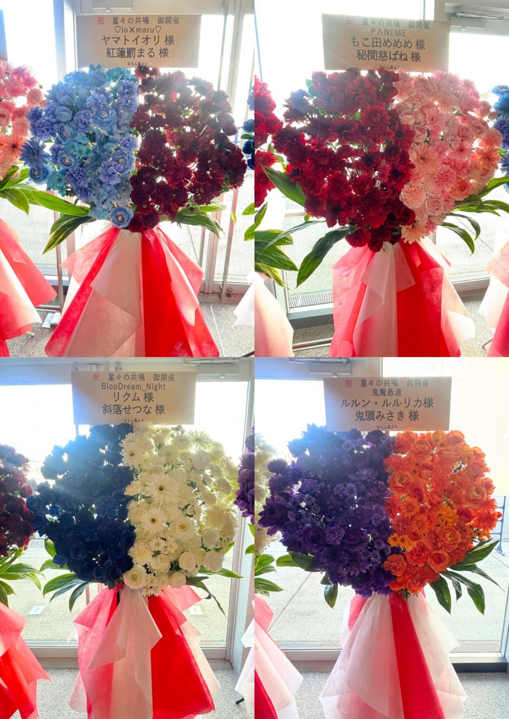 タッグユニットでの公演だったのでタッグの2人の公式カラーを用いたバイカラーのフラワースタンドを作成してもらいました。
