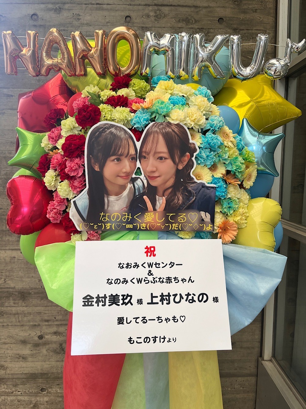 いつも素晴らしいパフォーマンスを見せてくれ、いっぱい元気を与えてくれる金村美玖さん・上村ひなのさんのお二人に日頃の感謝の気持ちを伝えたくてフラスタを贈らせていただきました。