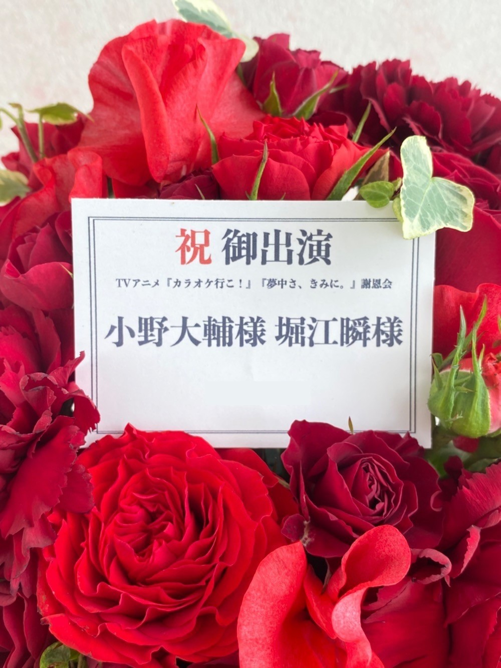 海老名市文化会館 大ホール 公演 [TVアニメ「カラオケ行こ!」「夢中さ、きみに。」謝恩会] 小野大輔様 堀江瞬様 ご出演祝い花・楽屋花
