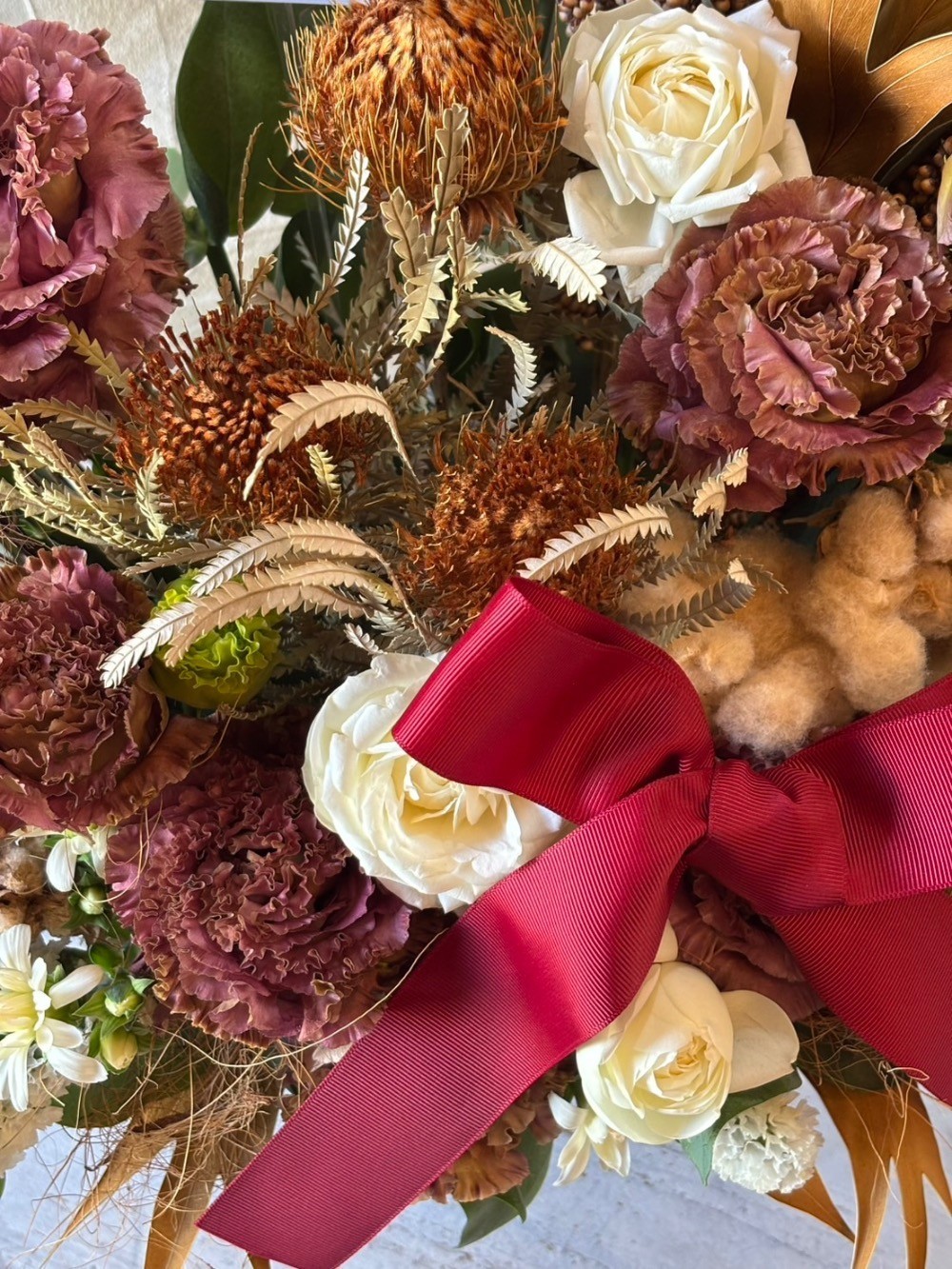 バレンタインイベントということで、チョコをイメージして茶色を基調としたお花に赤いリボンを添えていただきました。