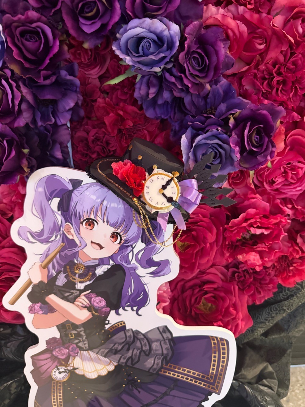 今回初めてフラスタを出した上で意識したのは、キャラクターのイメージカラーがピンク、キャラクターの髪色が紫、衣装が黒ベースでしたのでピンク、紫、黒を基準にシンプルに仕上げていただきました。